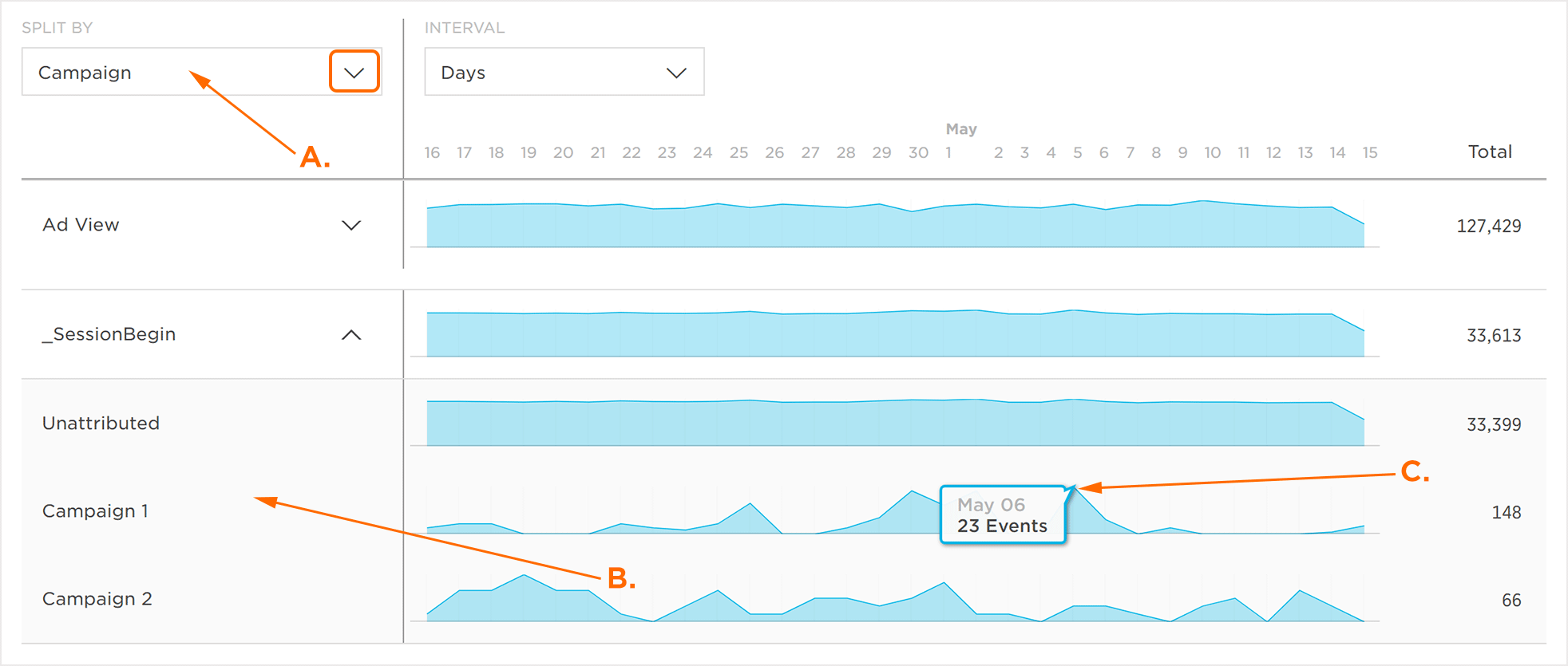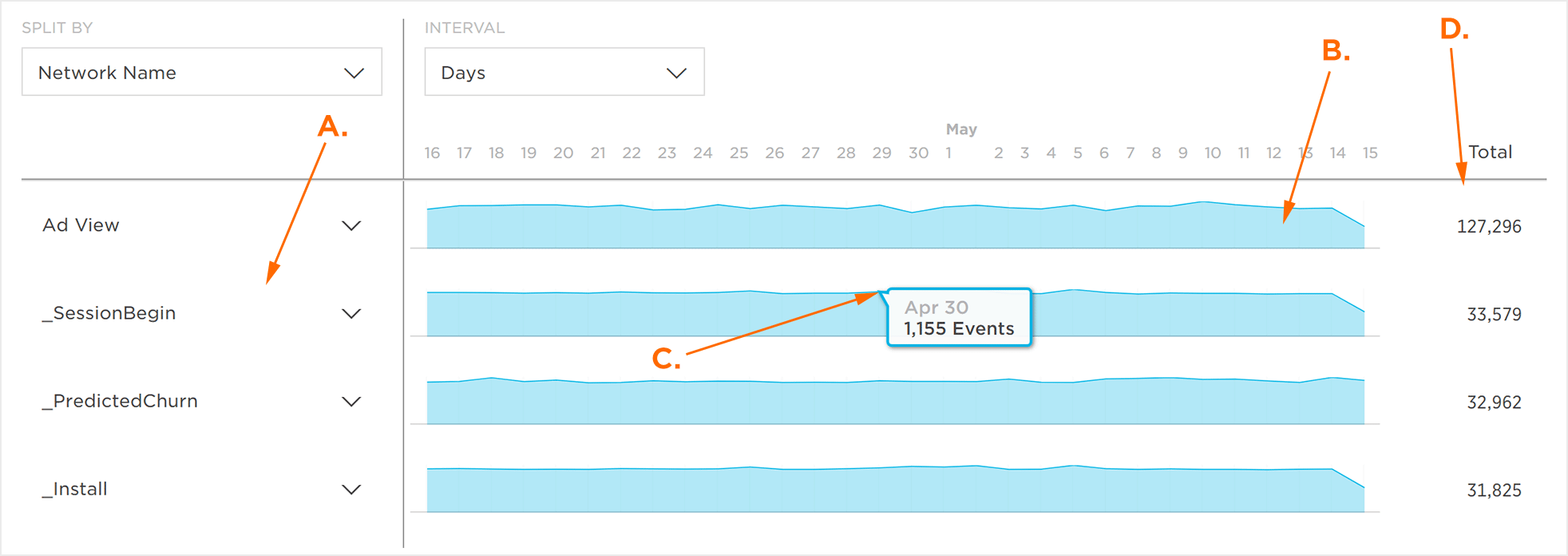 事件量图表分为3个主要部分,即事件名称,事件量的图形显示和所选时间范围的事件总计。将鼠标悬停在事件卷的图形显示内的任何事件上将显示与相应的日/周/月相关联的数据。