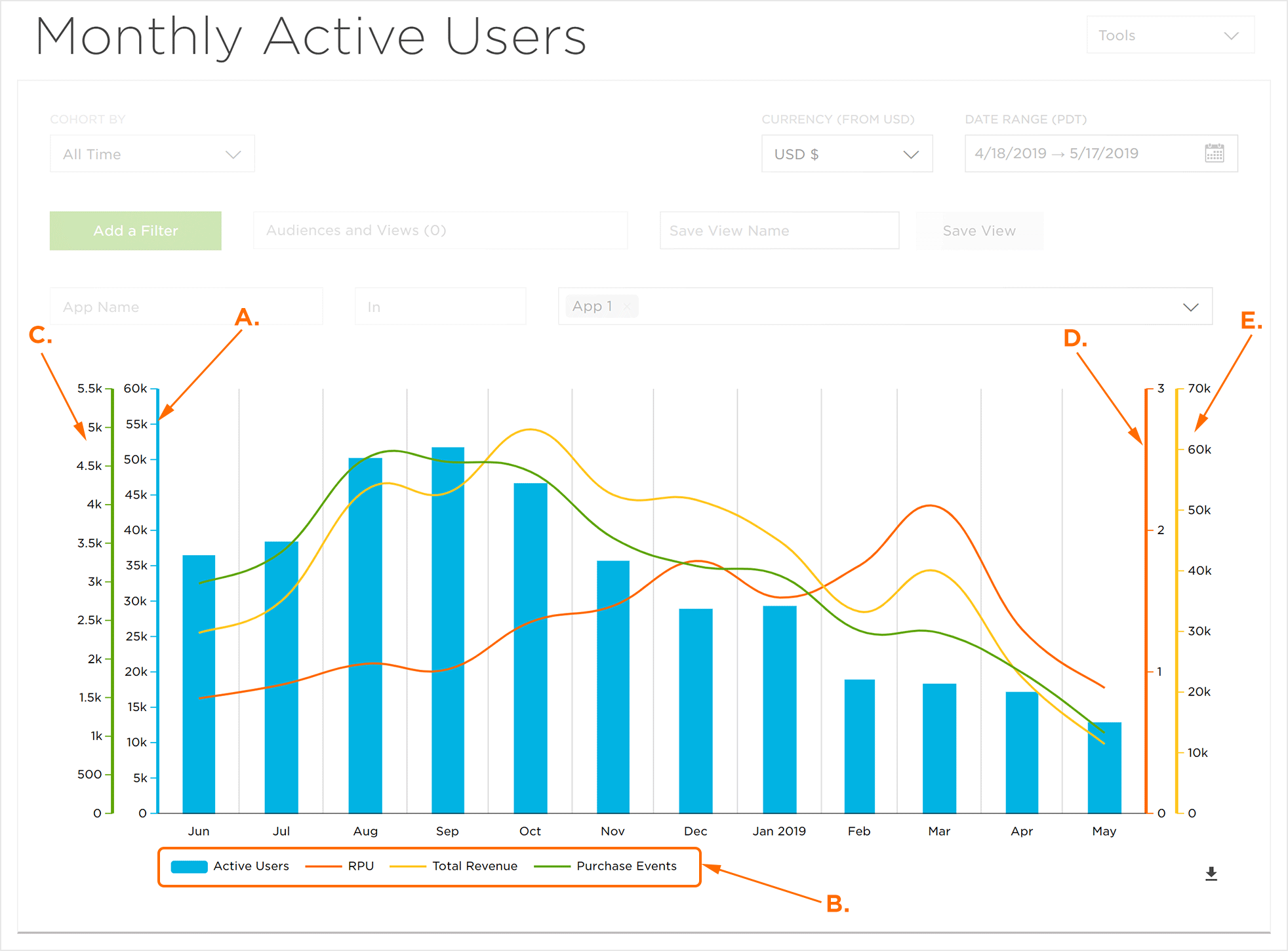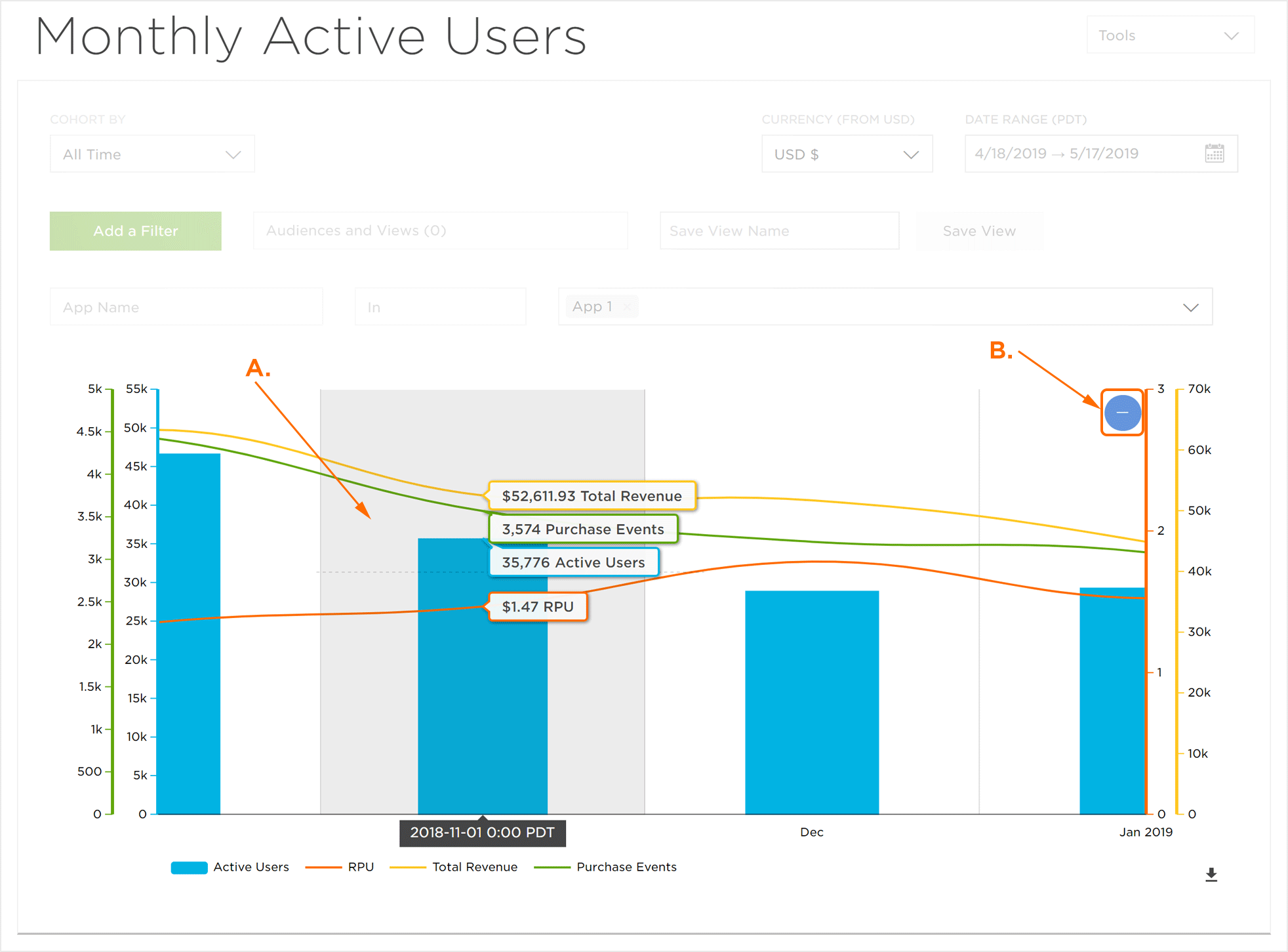 Analytics(分析)每月活动用户页面提供了选定时间范围内活动用户,RPU(每个用户的收入),总收入和购买事件的可视化。