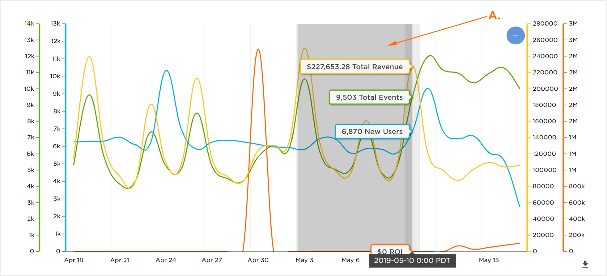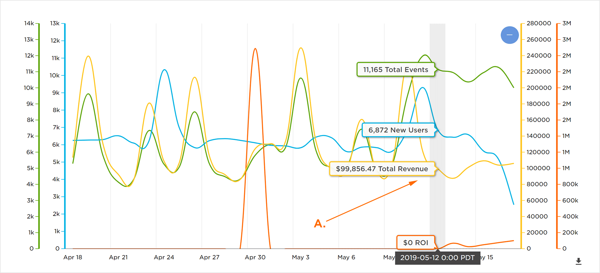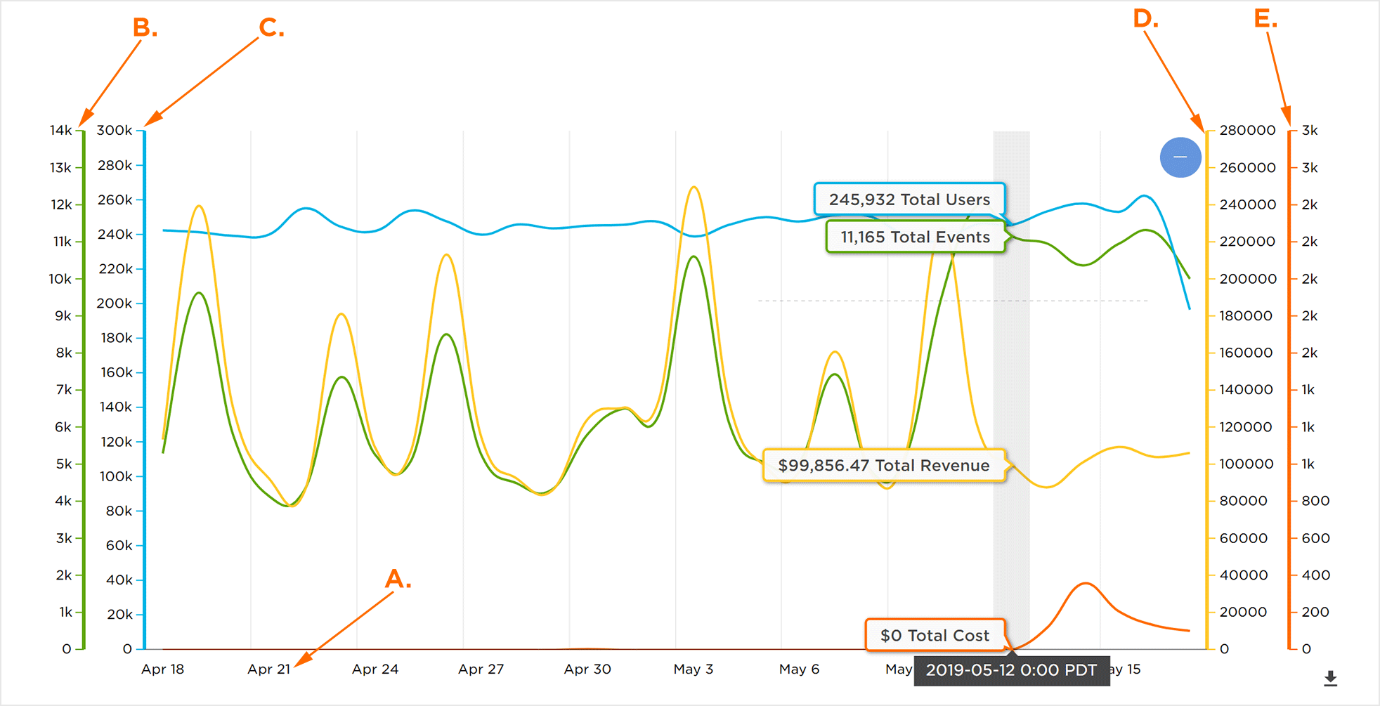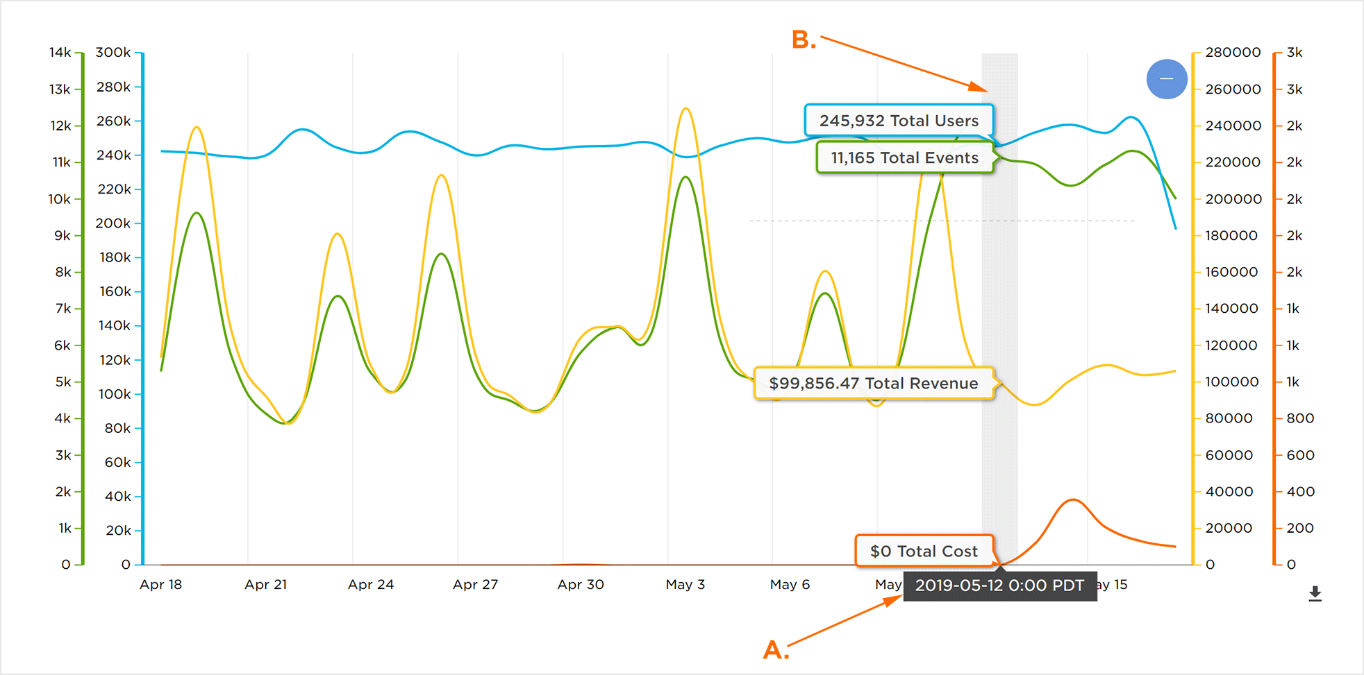 将鼠标悬停在交互式图表的任何部分上将显示时间范围内相应日期的每个类别(用户,事件量,收入和成本)的相应数据。沿水平轴移动鼠标将显示所选时间范围内任何日期的数据。