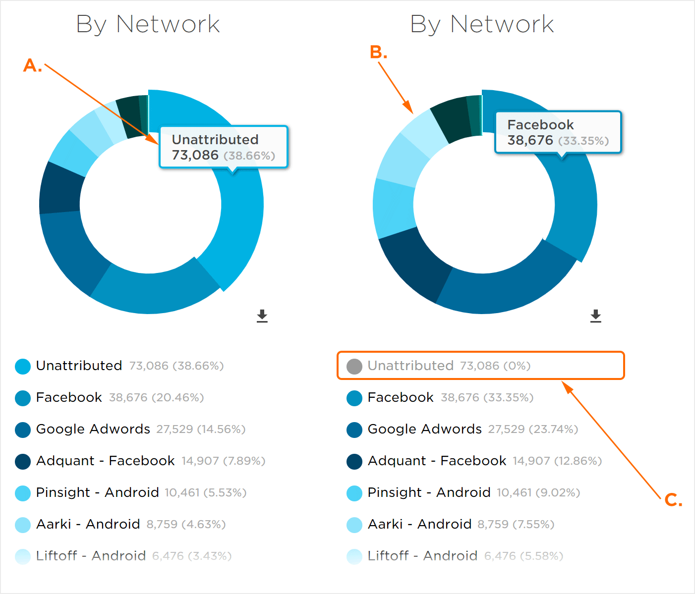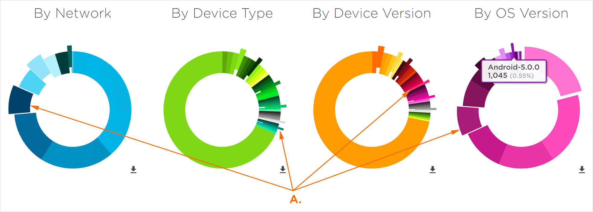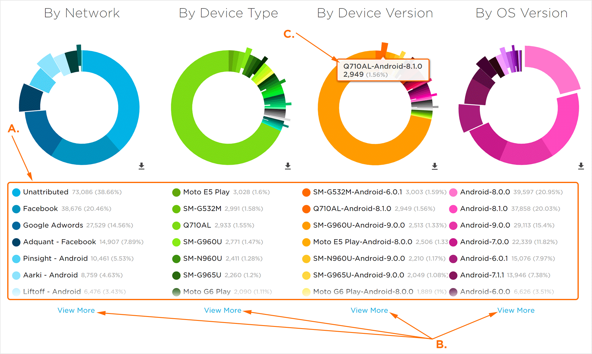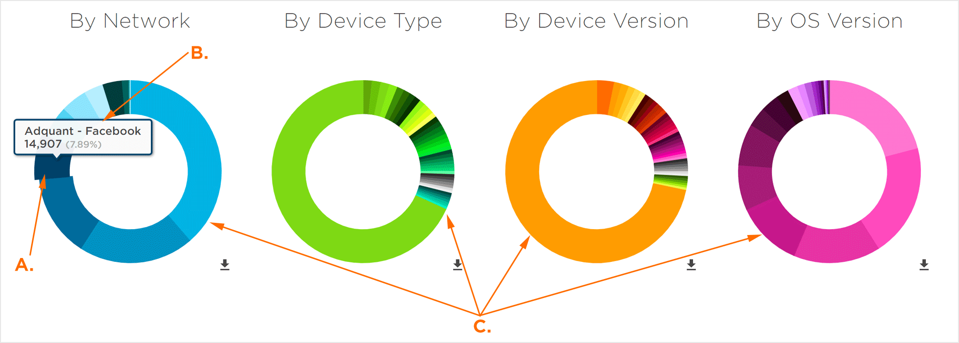 “新增安装”甜甜圈图按广告网络,设备类型,设备版本和操作系统版本显示应用程序安装。通过鼠标悬停在任何单独的部分上,可以在图表中轻松查看数据。将显示一个显示,详细说明部分标题,部分总计和百分比。数据的每个部分已经进行了颜色编码,便于识别。