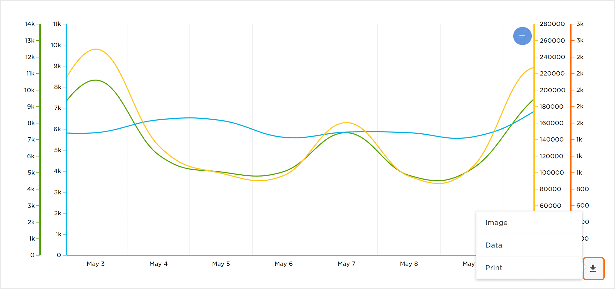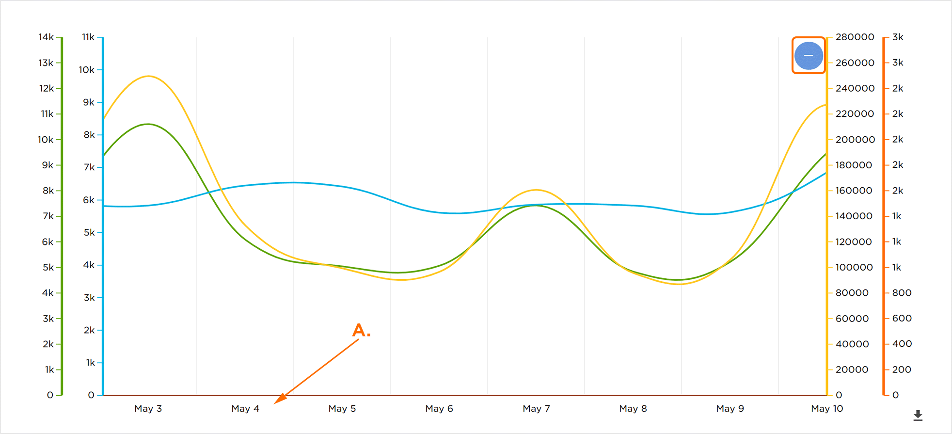 每个类别(用户,活动量,收入和成本)表示由垂直轴线的颜色编码,便于识别交互式图表上。横轴代表选定的日期范围内,所有总量沿日期范围的持续时间累积。