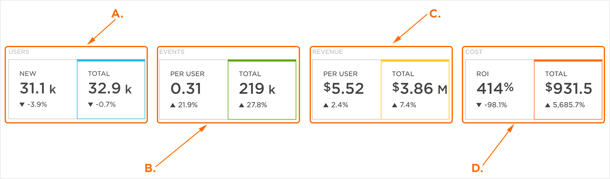 Overview页面提供了用户,活动,收入,与特定应用相关的成本和新增安装的可视化。页面被分成两个主要部分。首先说明了用户,活动,收入和成本;第二部分说明通过广告平台,设备类型和设备版本的新增安装。这两个部分是交互式显示屏使用户能够快速,有效地通过数据直观导航。