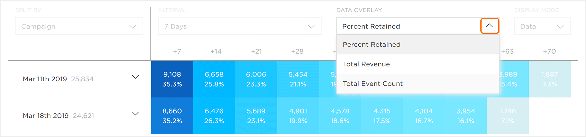 - 总事件数 注:默认情况下,显示保留的安装计数和关联的百分比。选择其中一个可用覆盖图时,保留的安装计数将保留。