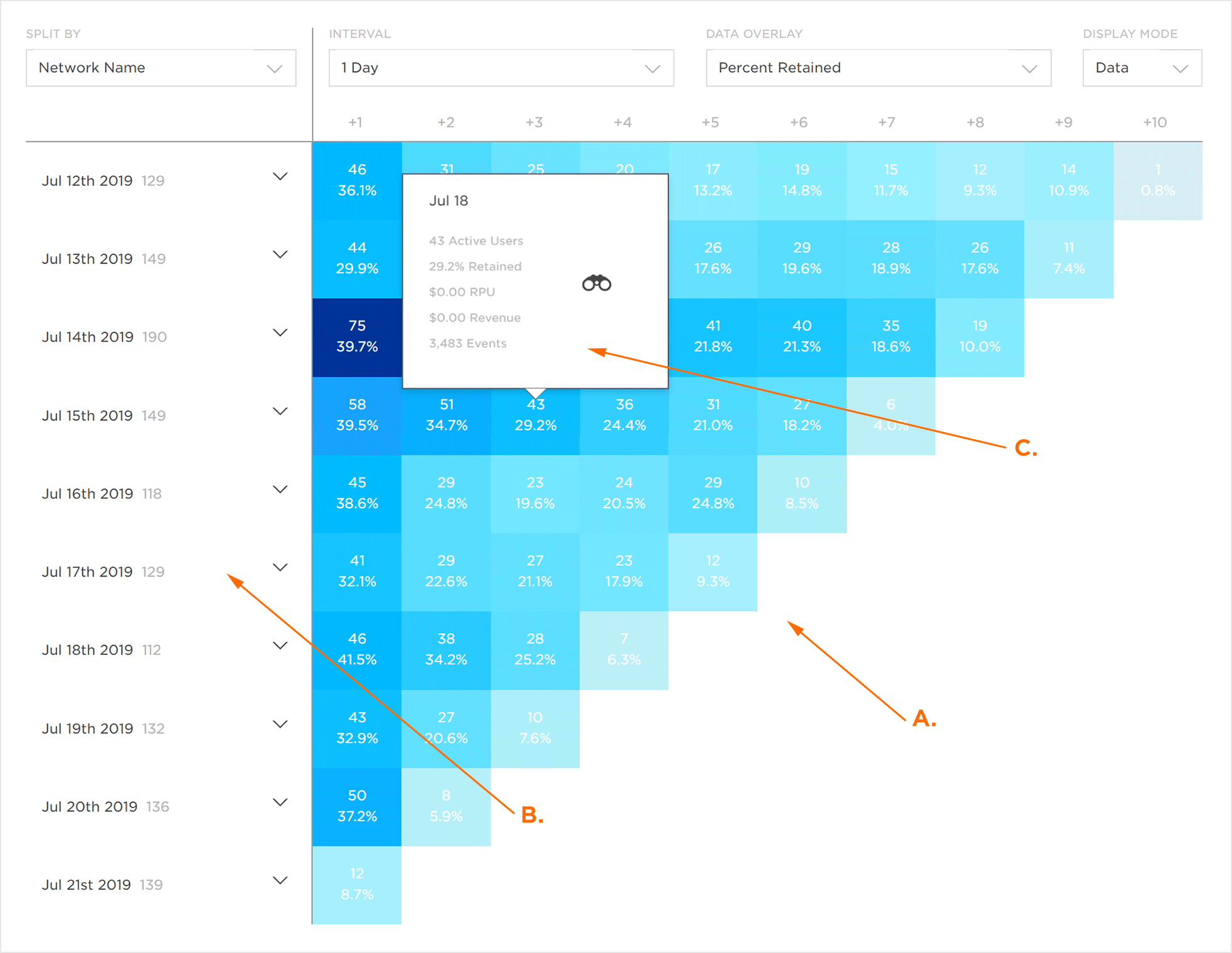注意:图形显示中的数据是颜色协调的。颜色越深表示留存率越高。每天的保留时间(例如+1,+2,+3)是初始安装计数的一个子集,而不是前一天的子集。