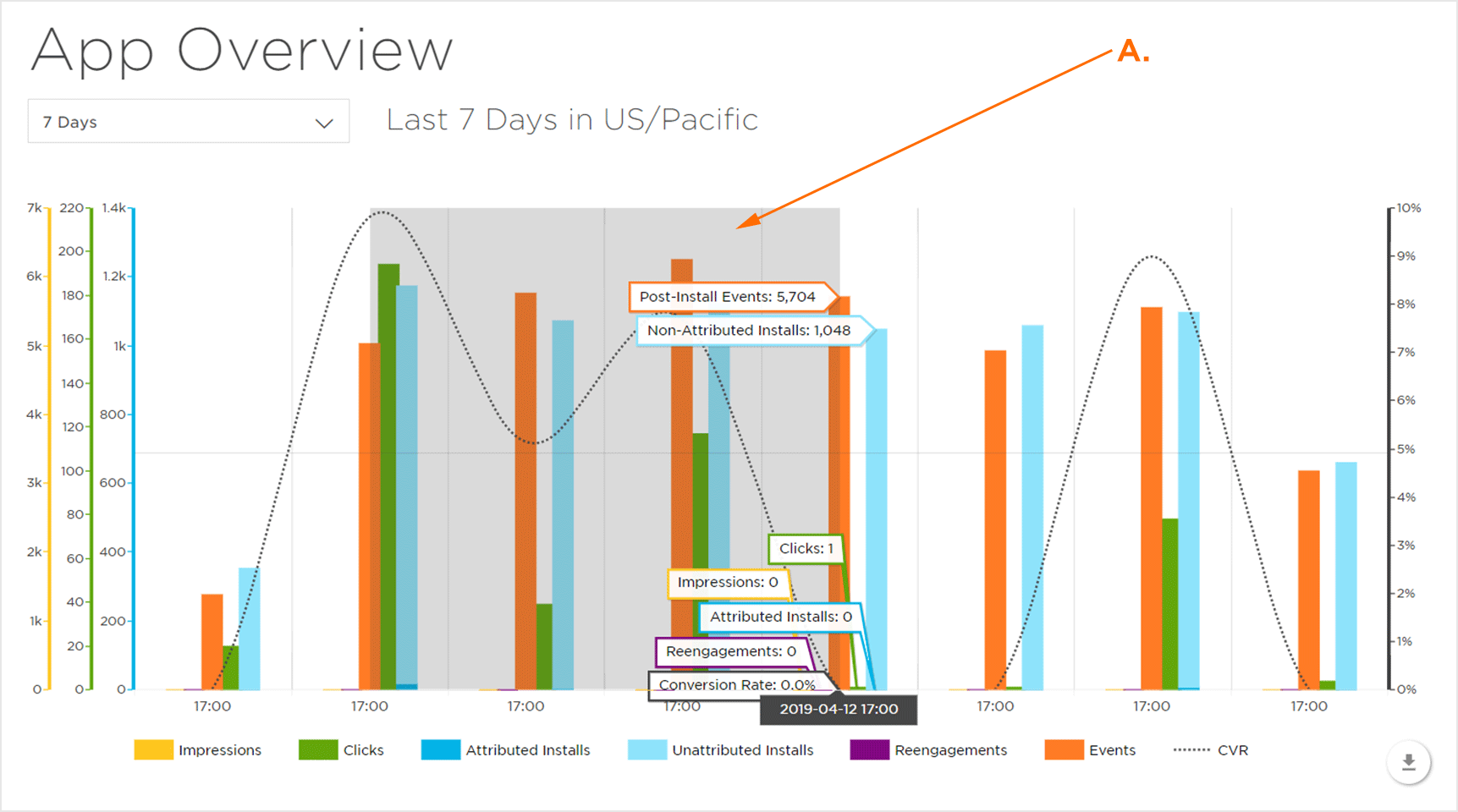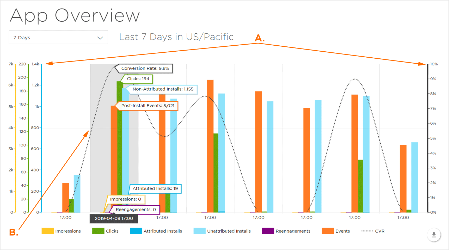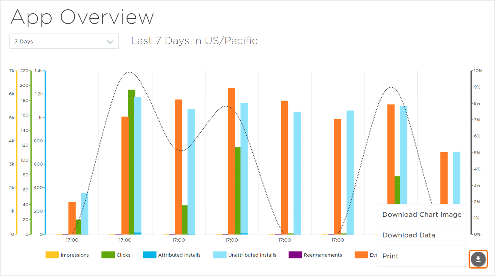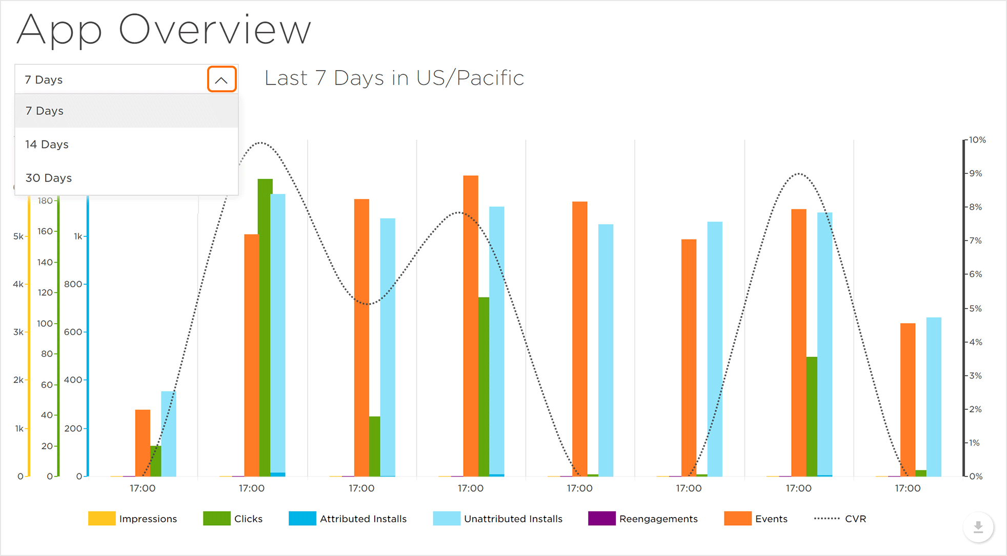 注意:默认情况下,概览图表仅显示“展示次数”,“点击次数”,“归因安装”,“Reengagement”和“CVR”。单击指标将显示或隐藏图表中的指标。