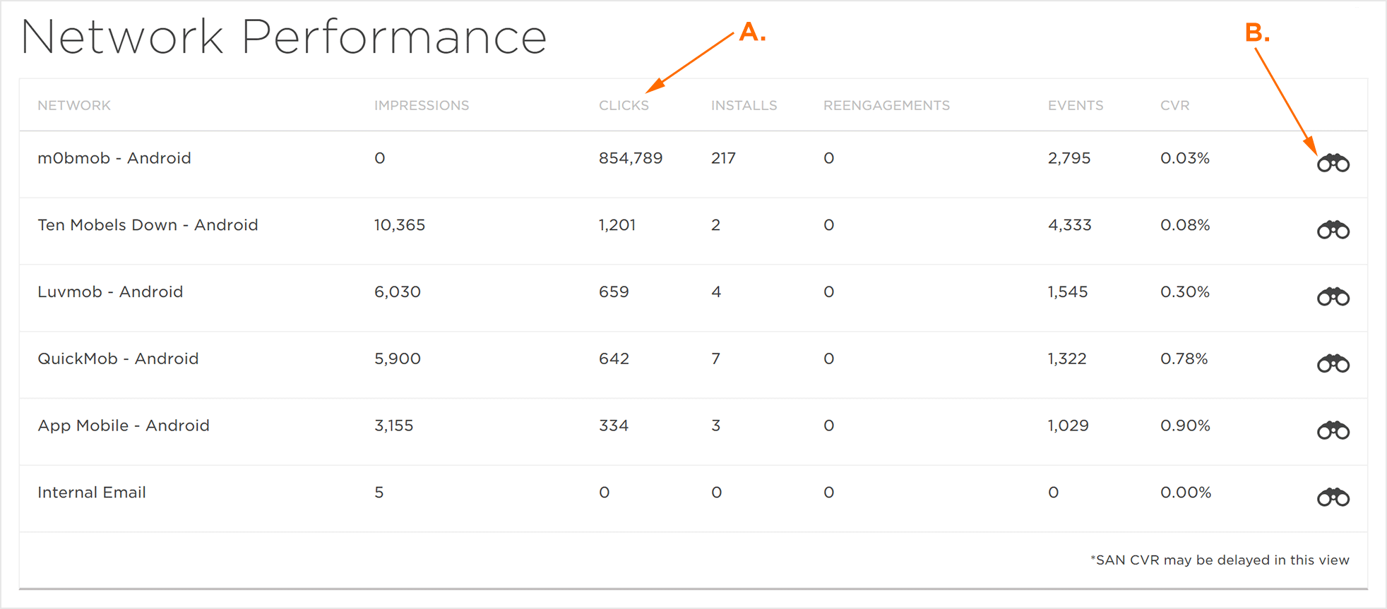 “广告平台效果”部分显示与每个广告平台关联的“展示”,“点击”,“安装”,“Reengagement”,“事件”和“CVR”数据。通过单击度量标准,可以按任何度量标准按升序或降序对“广告平台效果”部分中的数据进行排序。通过将鼠标悬停在所需网络上并单击双目图标,可以在Analytics Explorer中进一步扩展广告平台效果。