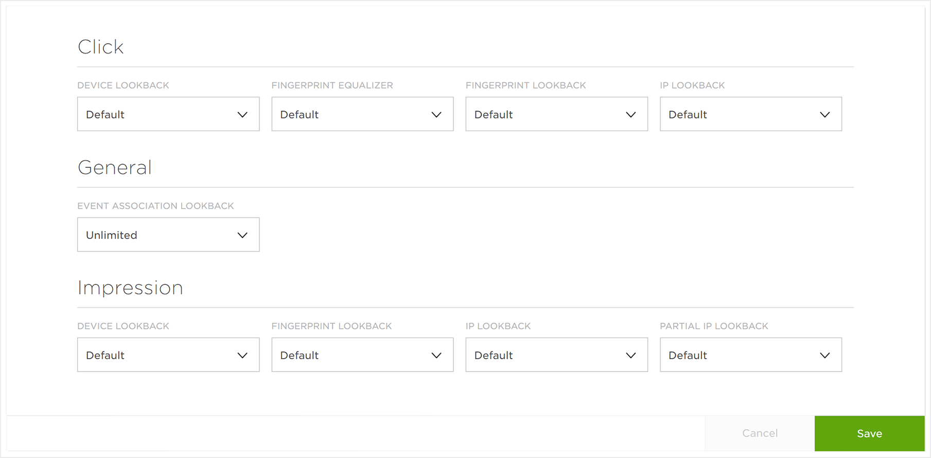 回溯窗口定义了从安装之时算起的回溯时间。对于点击和安装,设备和指纹匹配具有不同的回溯窗口配置。