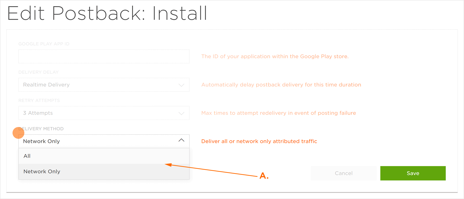 注意:交付方法确定合作伙伴是接收所有事件/安装还是仅接收他们已获得归因的那些事件/安装。