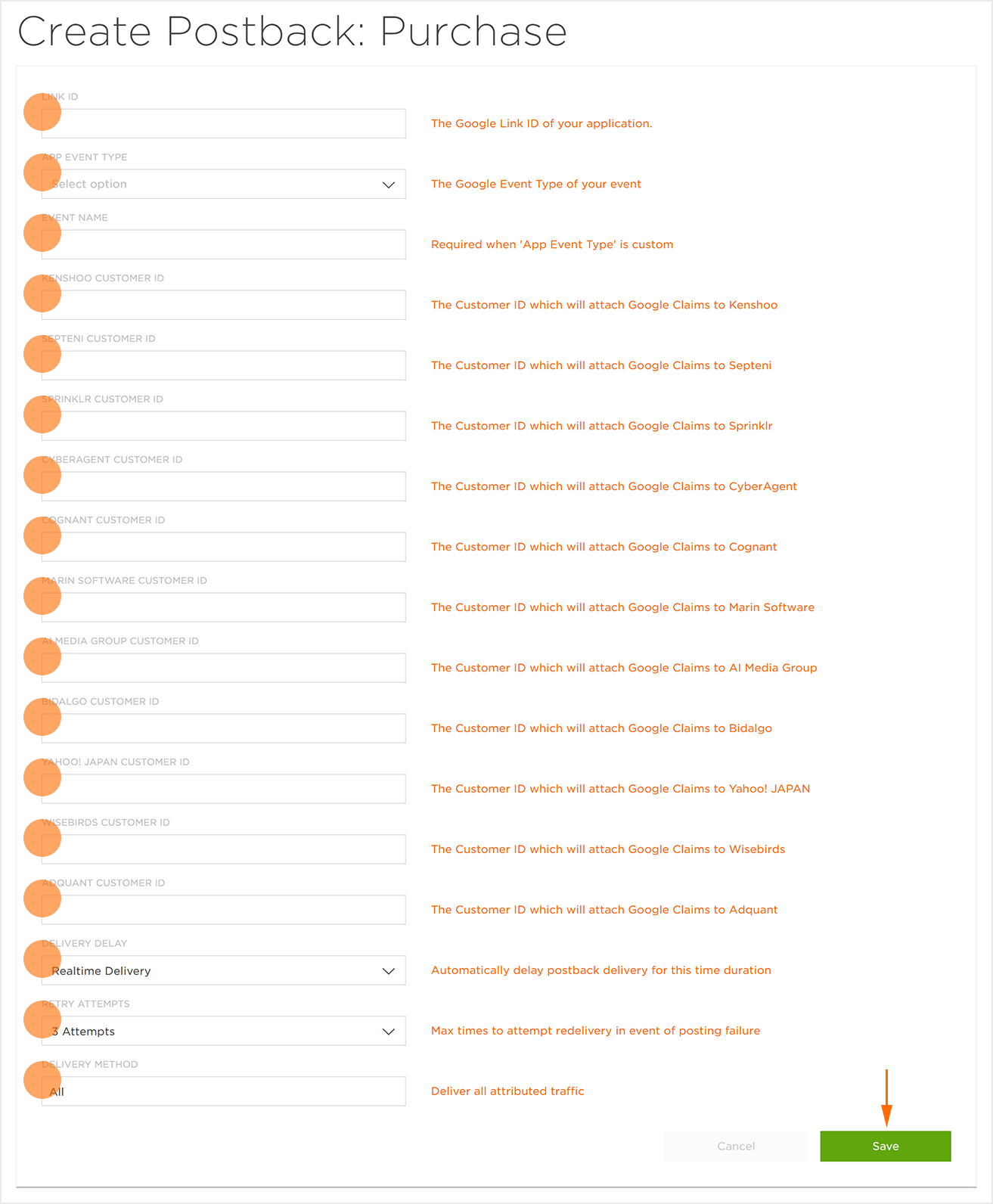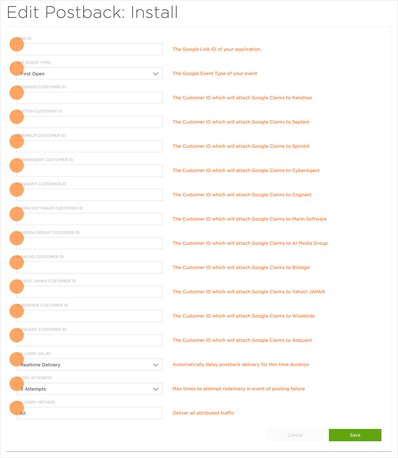 必须使用合作伙伴配置界面中的下拉菜单,使用相应的GoogleApp事件类型指定发送到Google的安装后事件。 Google有八种事件类型可供选择: