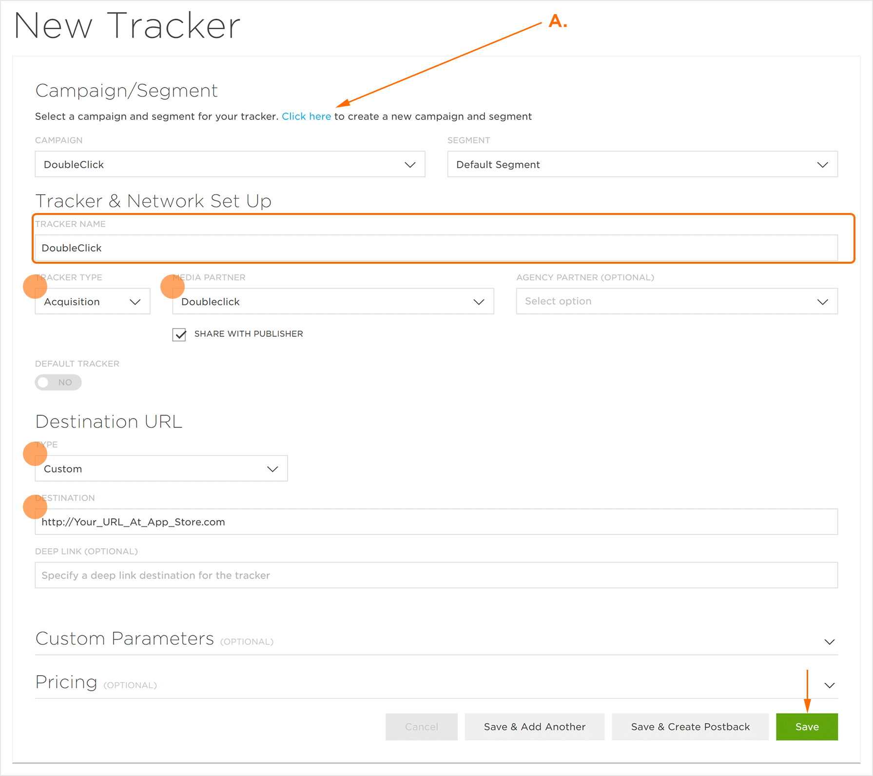 注意:为了简化广告系列/细分/跟踪器创建过程,添加了一项功能,以便在创建新跟踪器时创建广告系列和细分受众群。有关在添加新跟踪器时创建广告系列或细分受众群的更多信息,请参阅我们的创建安装广告系列支持文档。