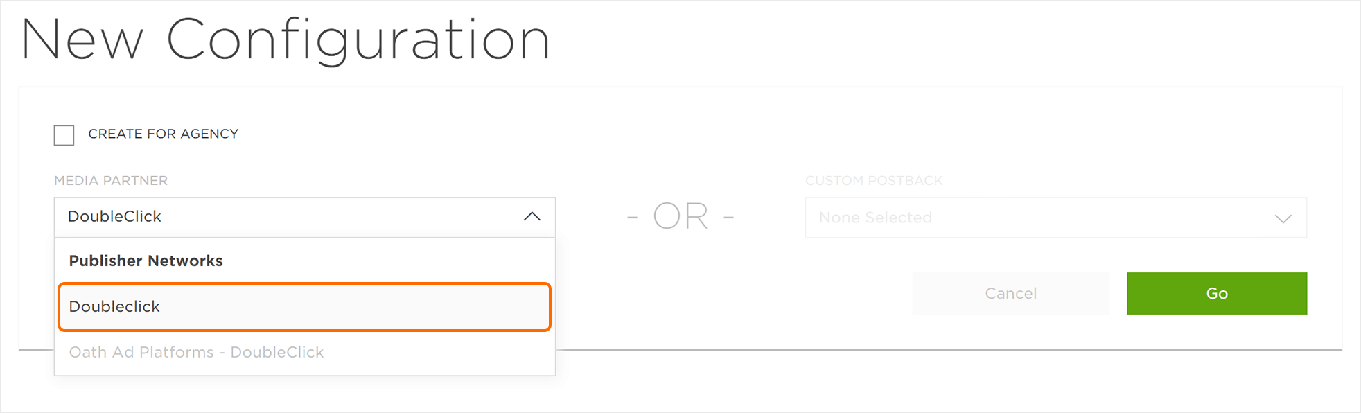 DoubleClick for Publisher合作伙伴应该作为TrackingIO Global方面的独立广告平台进行整合。一旦集成后,他们将能够在下拉列表中选择,并将显示为标准的TrackingIO Global认证合作伙伴。