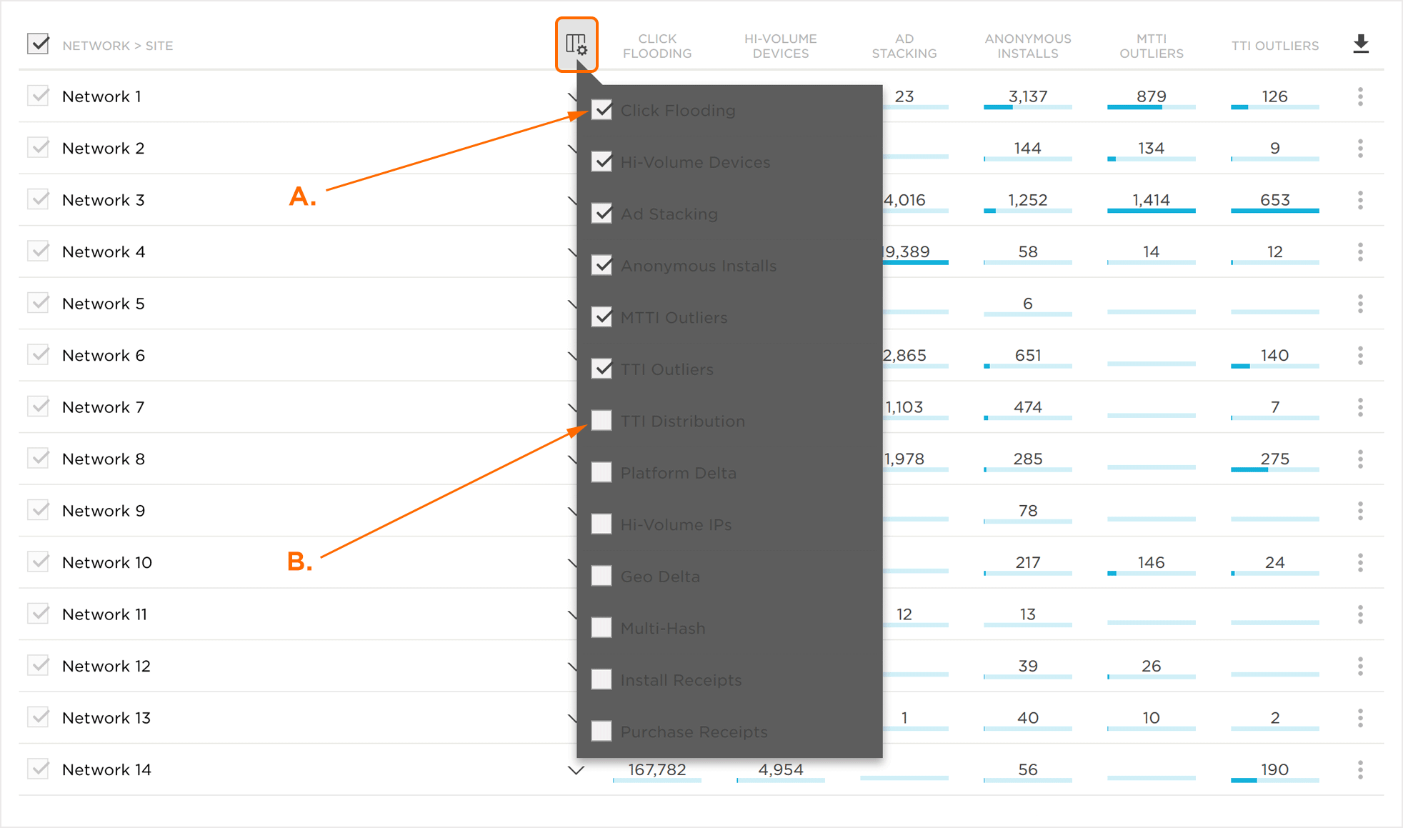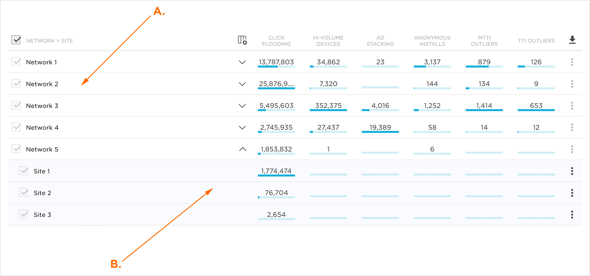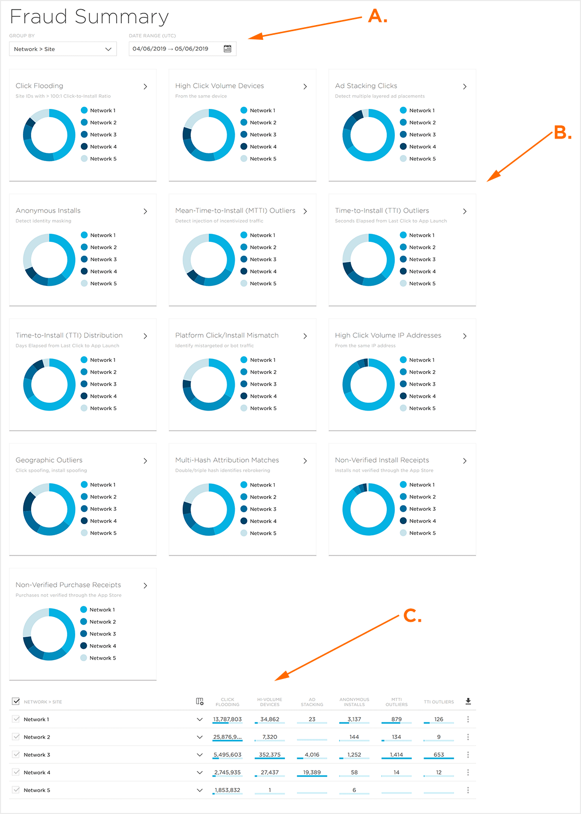 欺诈控制台深入研究TrackingIO Global欺诈预防工具中的统计异常值,突出显示可疑活动,并可以进一步轻松调查。数据按帐户,应用程序,网络和站点分组,使营销人员能够在非常精细的级别上分析流量。欺诈控制台以各种视图提供图形和行级数据。