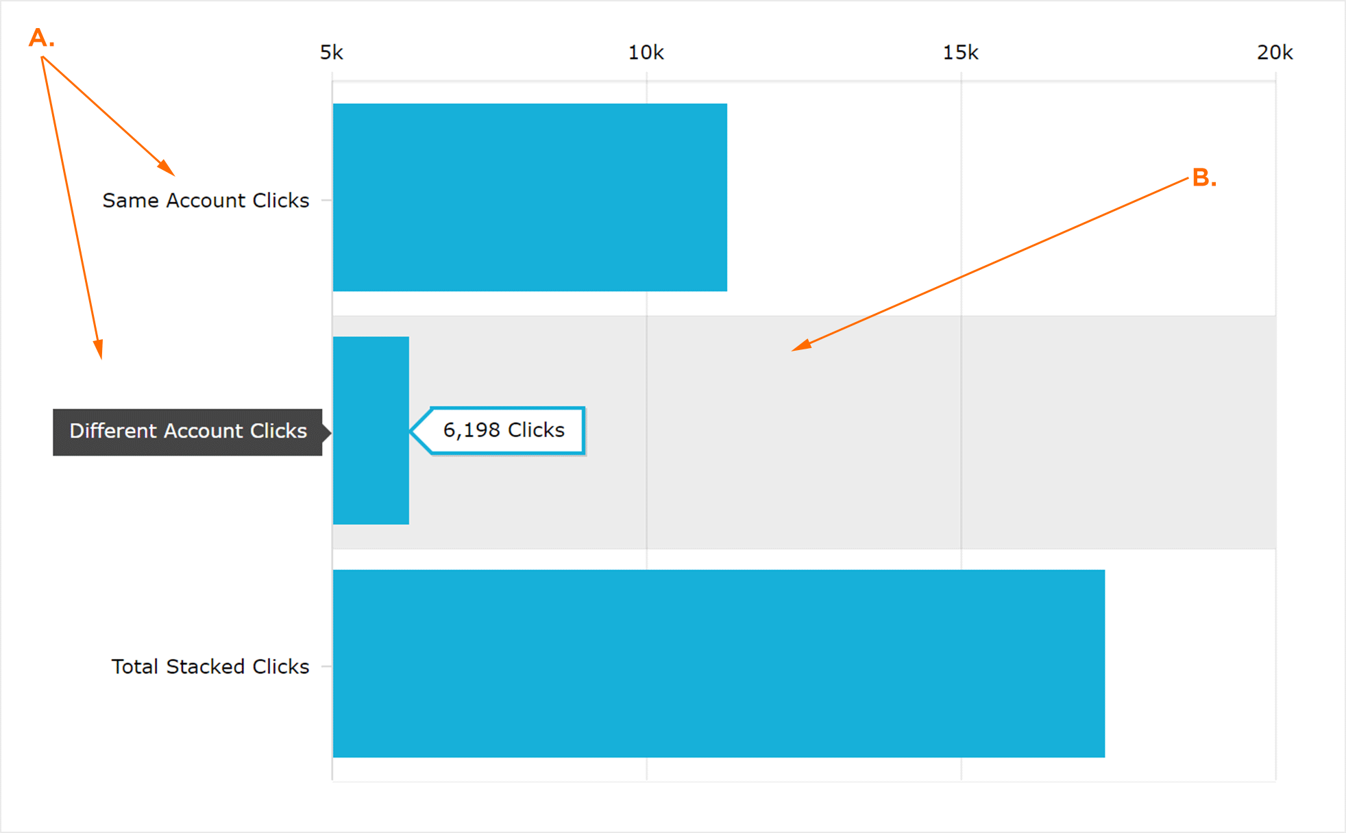 点击图表是与广告堆叠相关联的相同帐户点击次数,不同帐户点击次数,总点击次数和安装次数的直观表示。将鼠标悬停在其中一个广告堆叠类别上将显示该类别的特定数据。