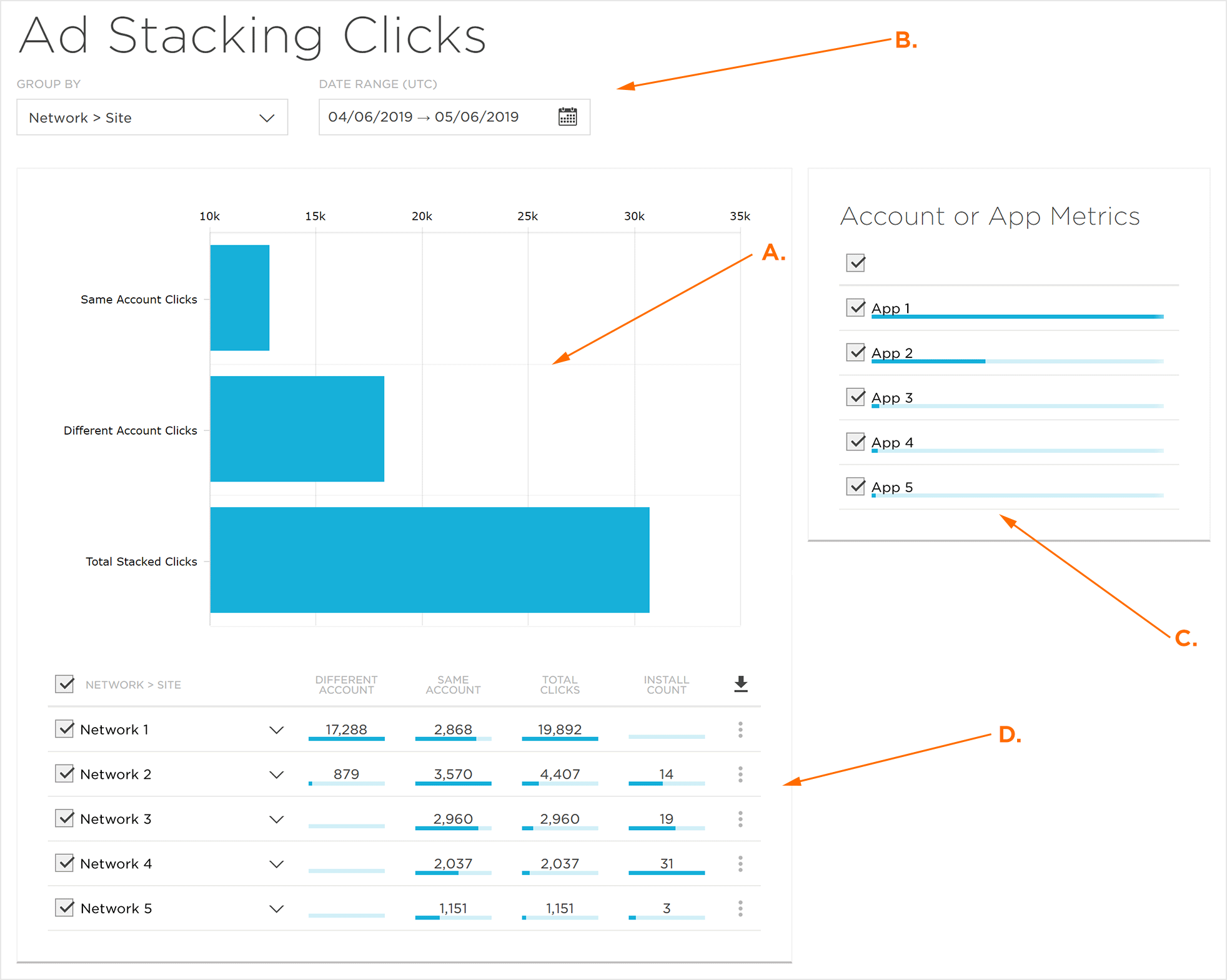 广告堆叠点击页面分为四个主要部分:点击图表,指标部分,帐户/应用选择部分和数据详细信息部分。