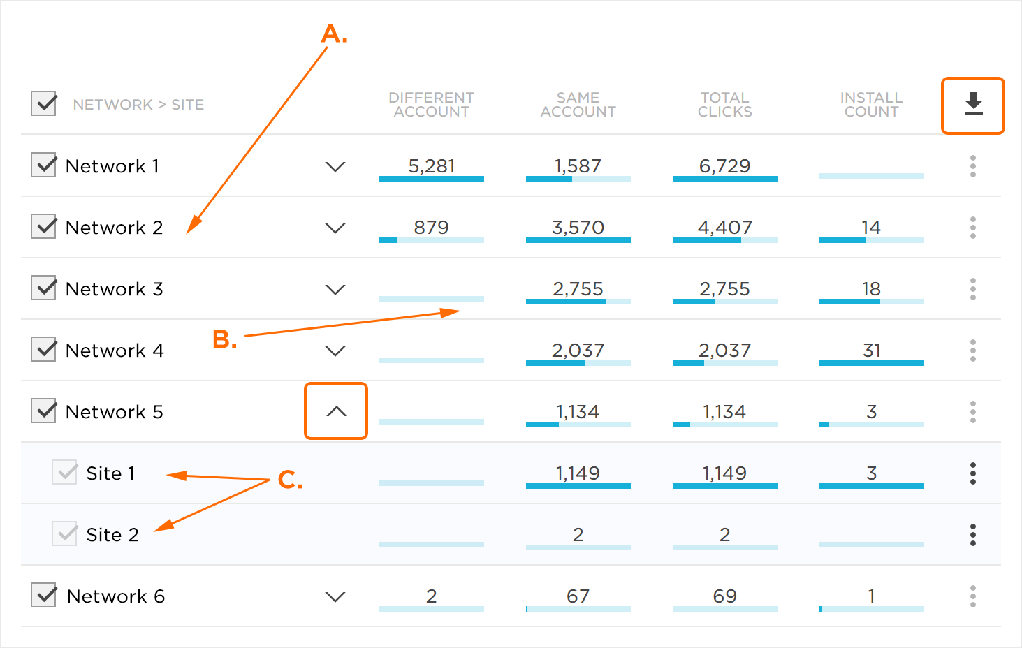 平台中显示的数据单击/安装不匹配的卷图和数据详细信息部分显示与所选帐户或应用关联的数据。默认情况下,所有高级发布商帐户或营销应用都已选中。帐户或应用可能被取消选择,与该帐户或应用关联的数据量将通过该帐户或应用正下方的蓝条指示。