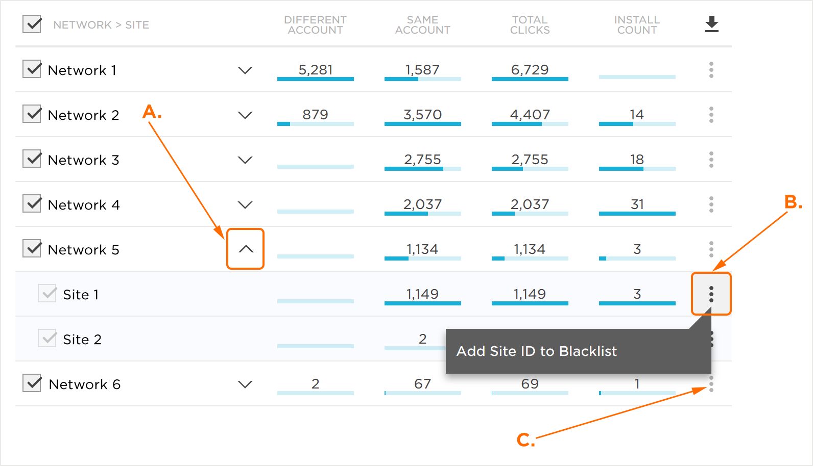 注意:应用,广告平台和跟踪器不符合加入全球欺诈黑名单的资格。他们将“将Site id添加到黑名单”按钮将显示为灰色。