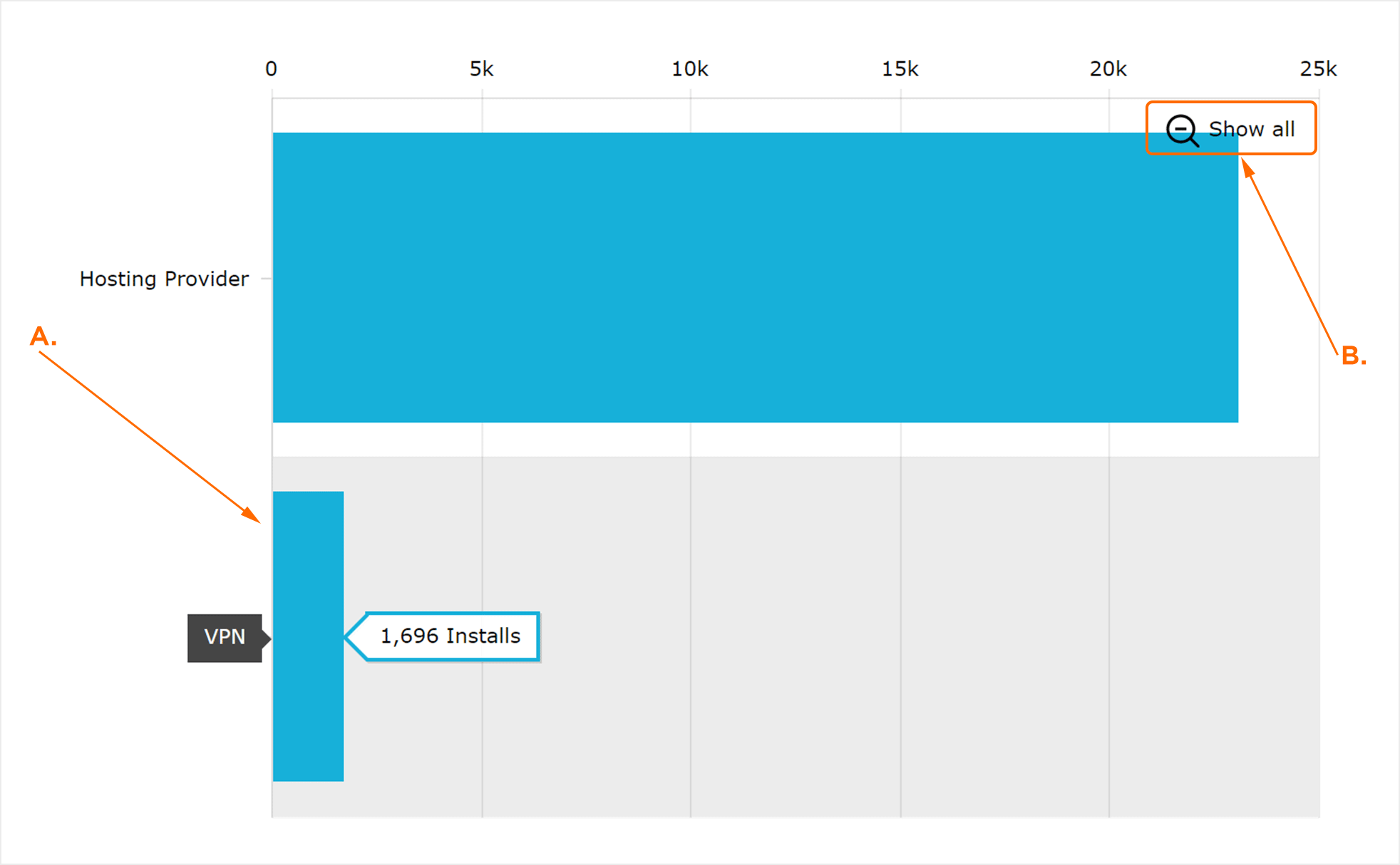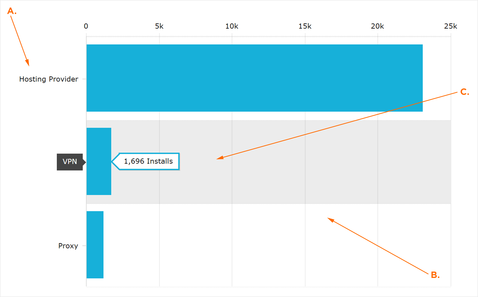 匿名安装卷图是对IP地址进行匿名化的安装的可视化表示。 TrackingIO Global识别与匿 名器相关联的安装,如主机提供商,VPN,代理服务器和TOR应用程序。鼠标悬停在任何行将显示相应的匿名器的安装卷。