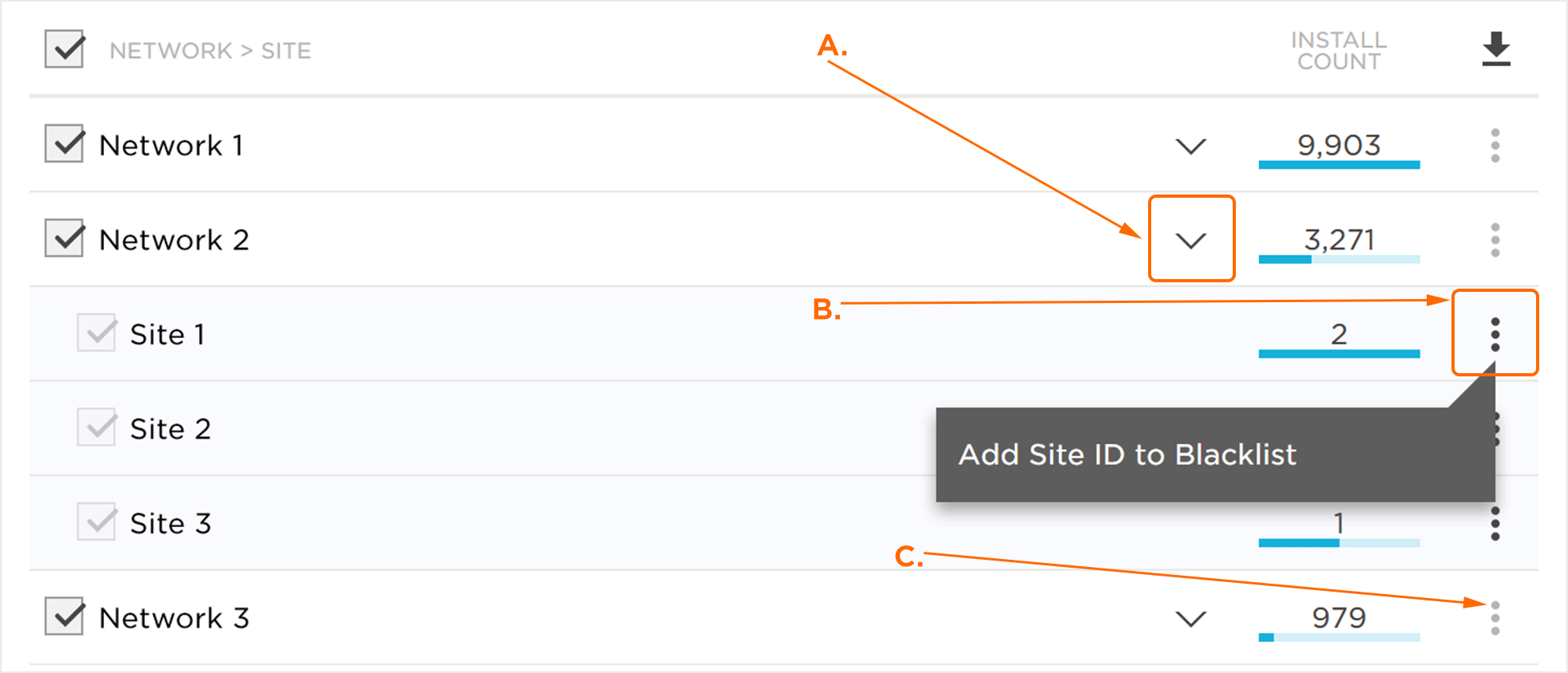 注意:应用,广告平台和跟踪器不符合加入全球欺诈黑名单的资格。他们将“将Site id添加到黑名单”按钮将显示为灰色。