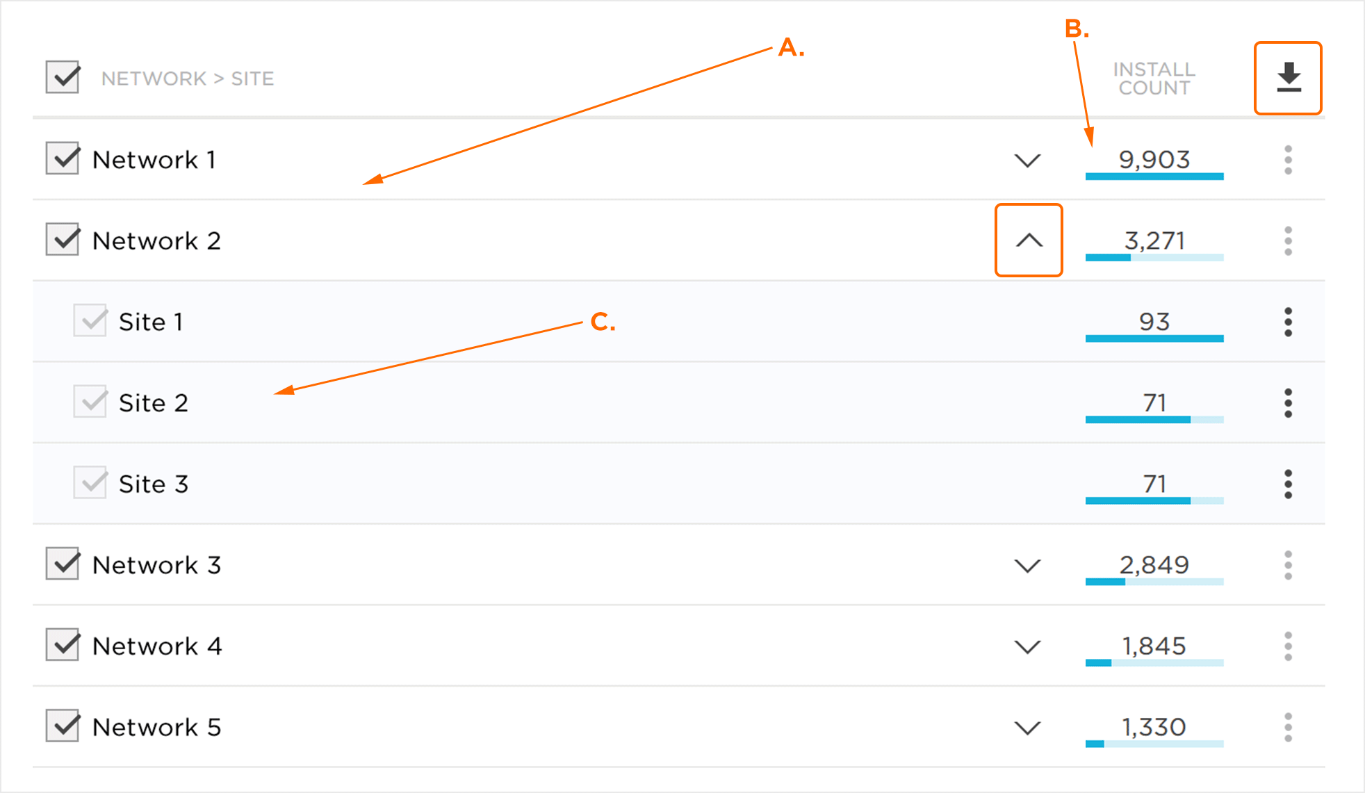 “匿名安装”页面分为四个主要部分:匿名安装卷量,指标部分,帐户/应用选择部分和数据详细信息部分。