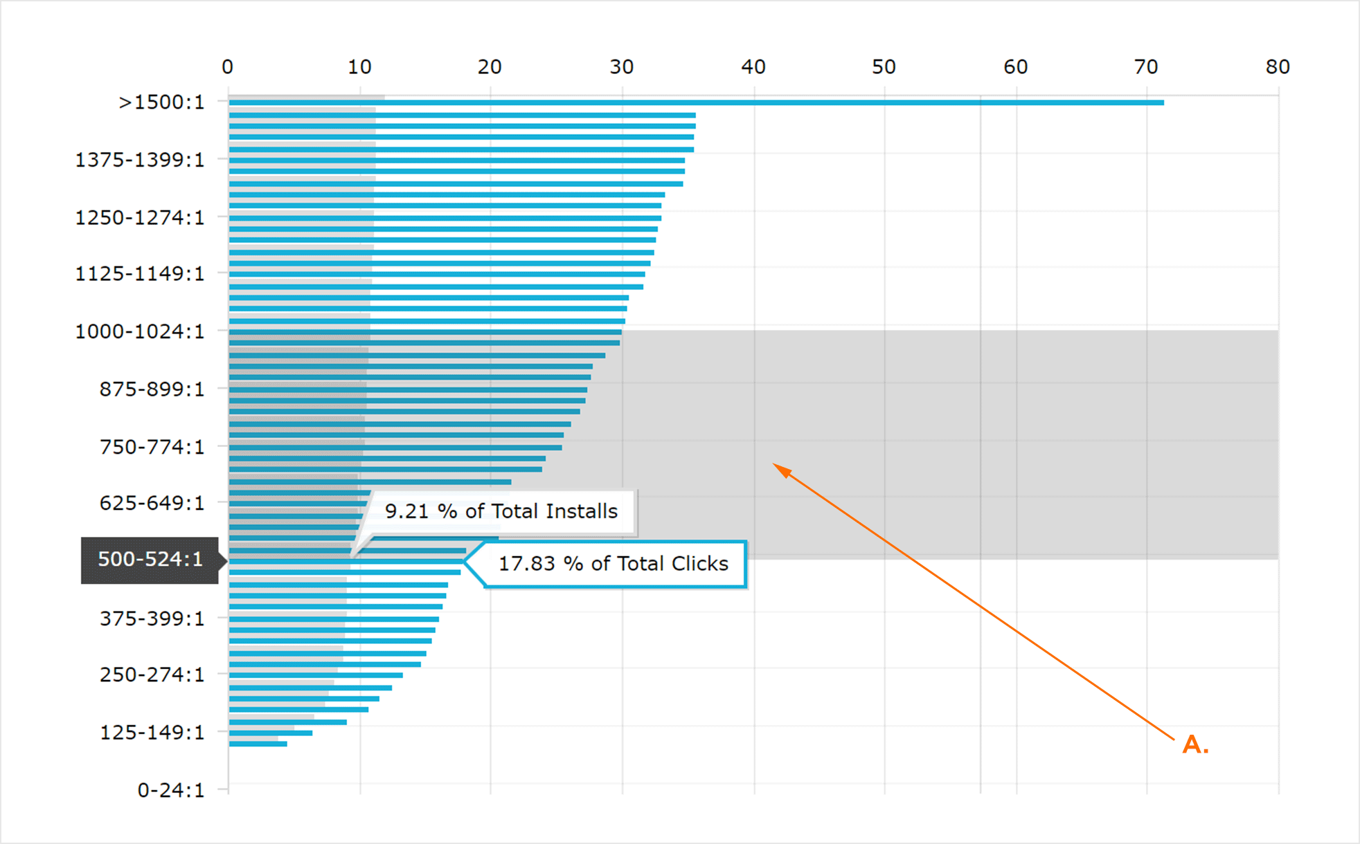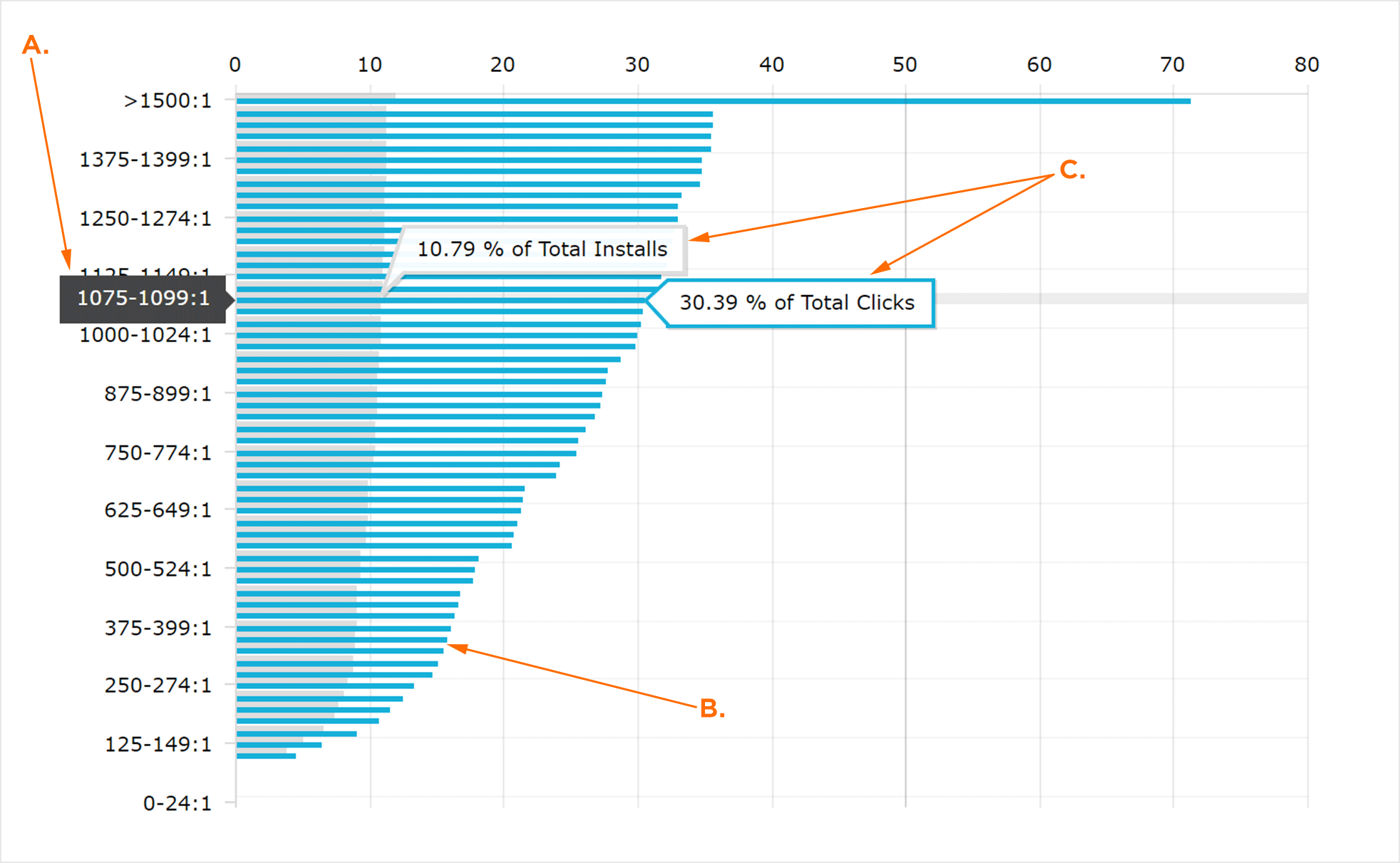 点击泛滥图表是可识别的点击累计百分比和安装累计百分比的直观表示。将鼠标悬停在任何行上,都会显示归因于点击百分比的总安装的相应百分比。