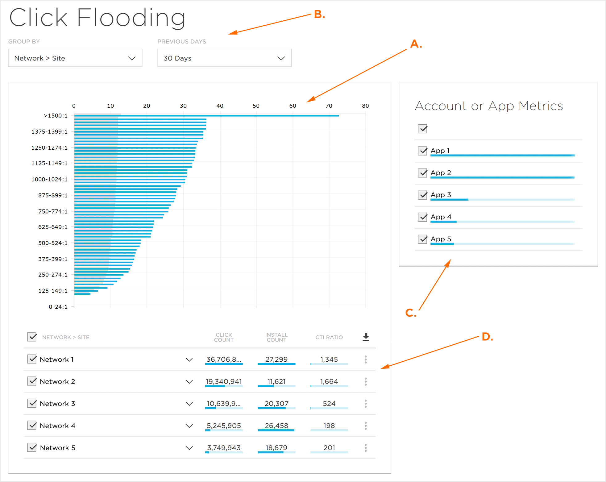 功能摘要:点击泛滥或是一种欺诈类型,其中发送大量点击以尝试在安装发生之前获得最终点击。欺诈点击泛滥页面提供了与安装次数相比的详细点击次数。该页面显示每个安装的点击次数的图形概览,以及显示点击次数,安装次数和CTI比率的详细信息部分。数据可能会显示60天,30天或7天的窗口,并可能按照几个不同的度量标准进行分组。