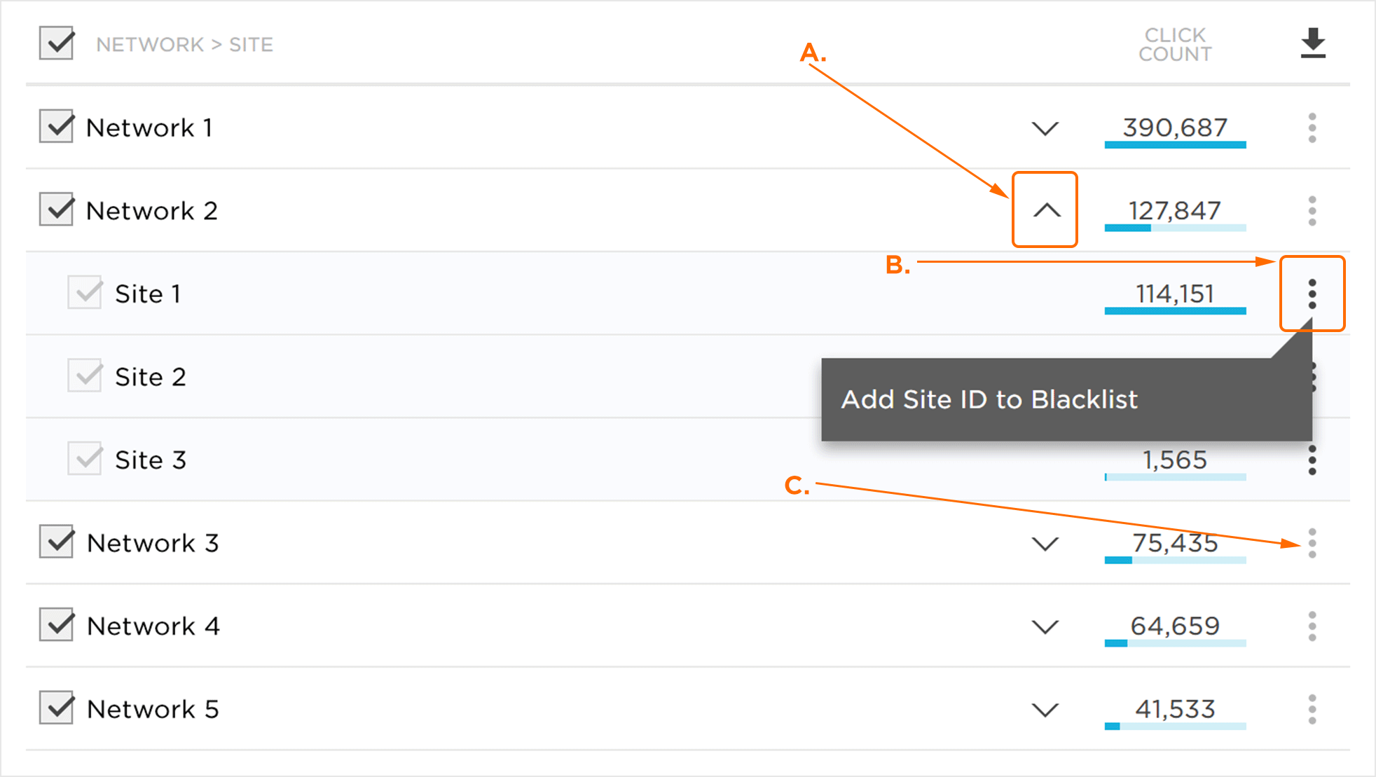 注意:应用,网络和跟踪器不符合加入全球欺诈黑名单的资格。他们将“将site ID添加到黑名单”按钮将显示为灰色。