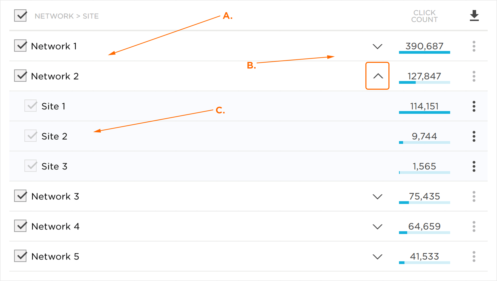 详细数据部分详细介绍了特定的点击次数。数据按选定的分组依据选项进行组织,选择或取消选择将反映在设备点击量图中。数据也可以导出到CSV文件。