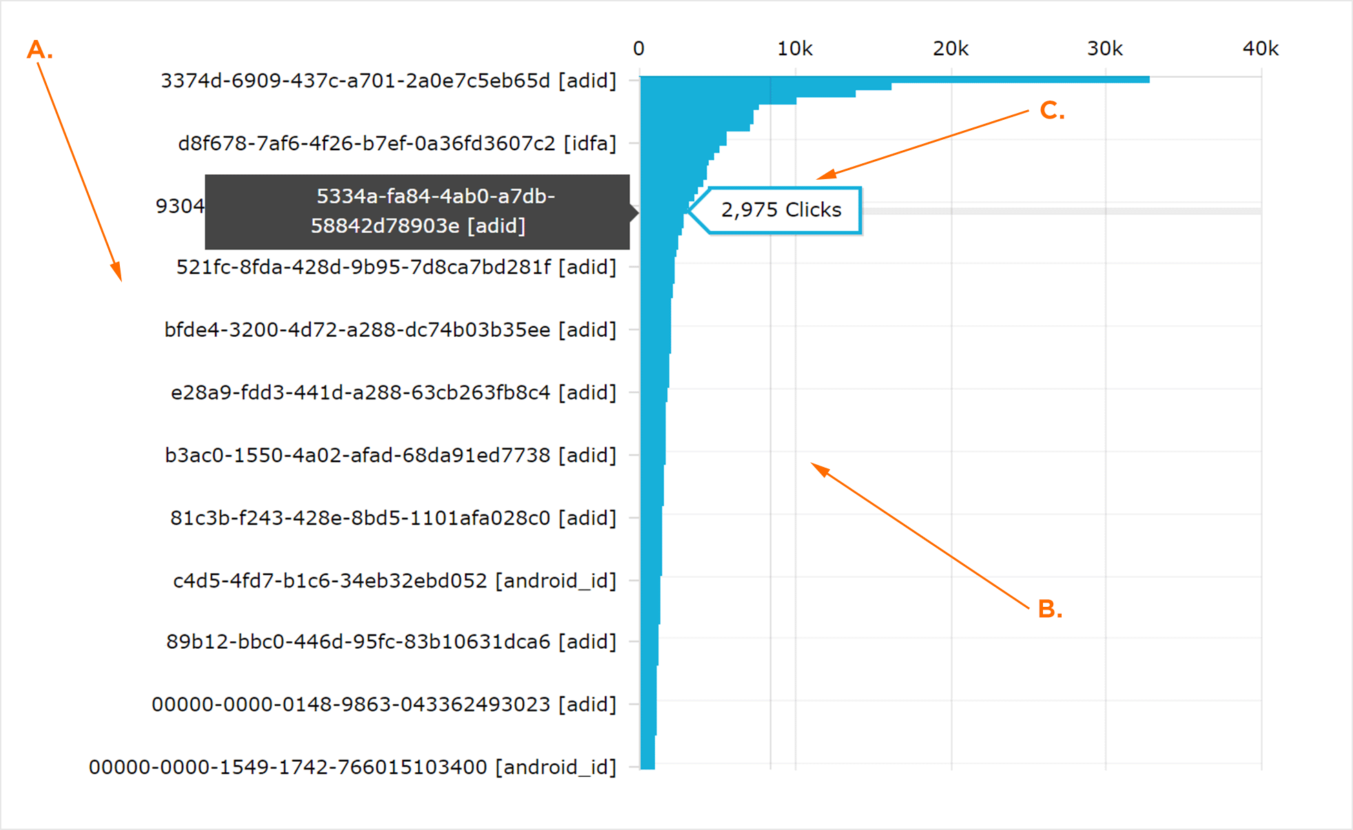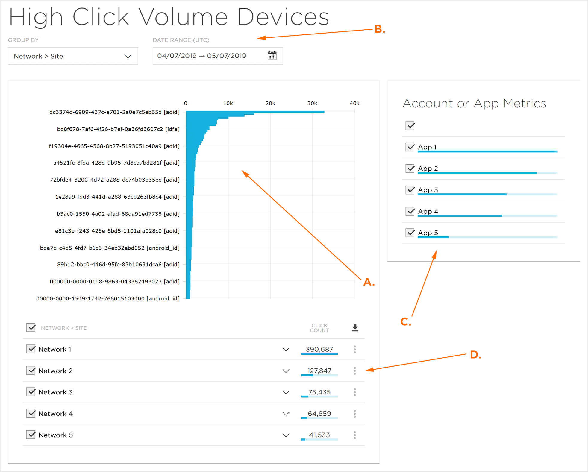 “大点击设备”页面分为四个主要部分:设备点击量图表,指标部分,帐户/应用选择部分和数据详细信息部分。