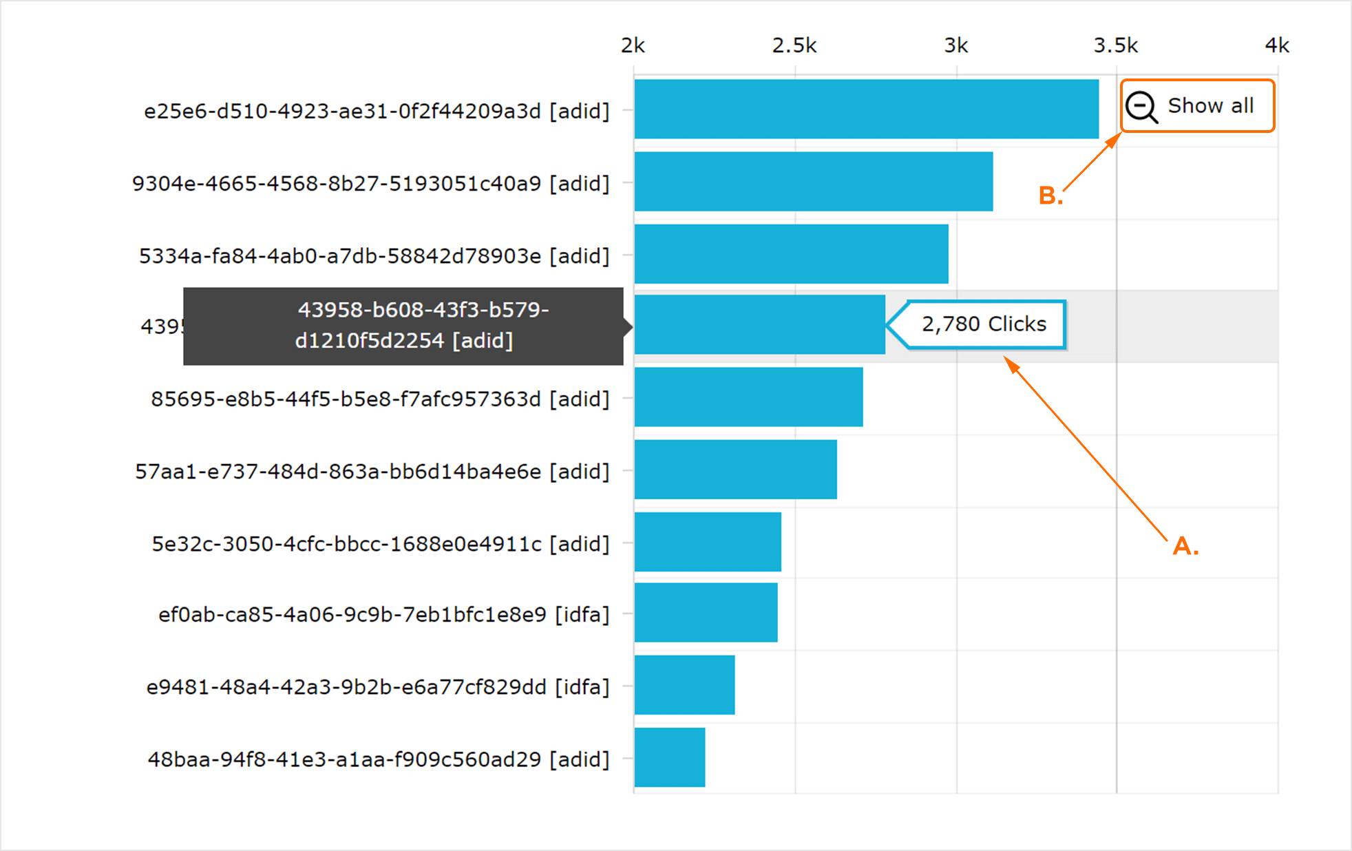 设备点击量图和数据详情部分中显示的数据与选定的帐户或应用关联。默认情况下,所有高级发布商帐户或营销应用都已选中。帐户或应用可能被取消选择,与该帐户或应用关联的数据量将通过该帐户或应用正下方的蓝条指示。