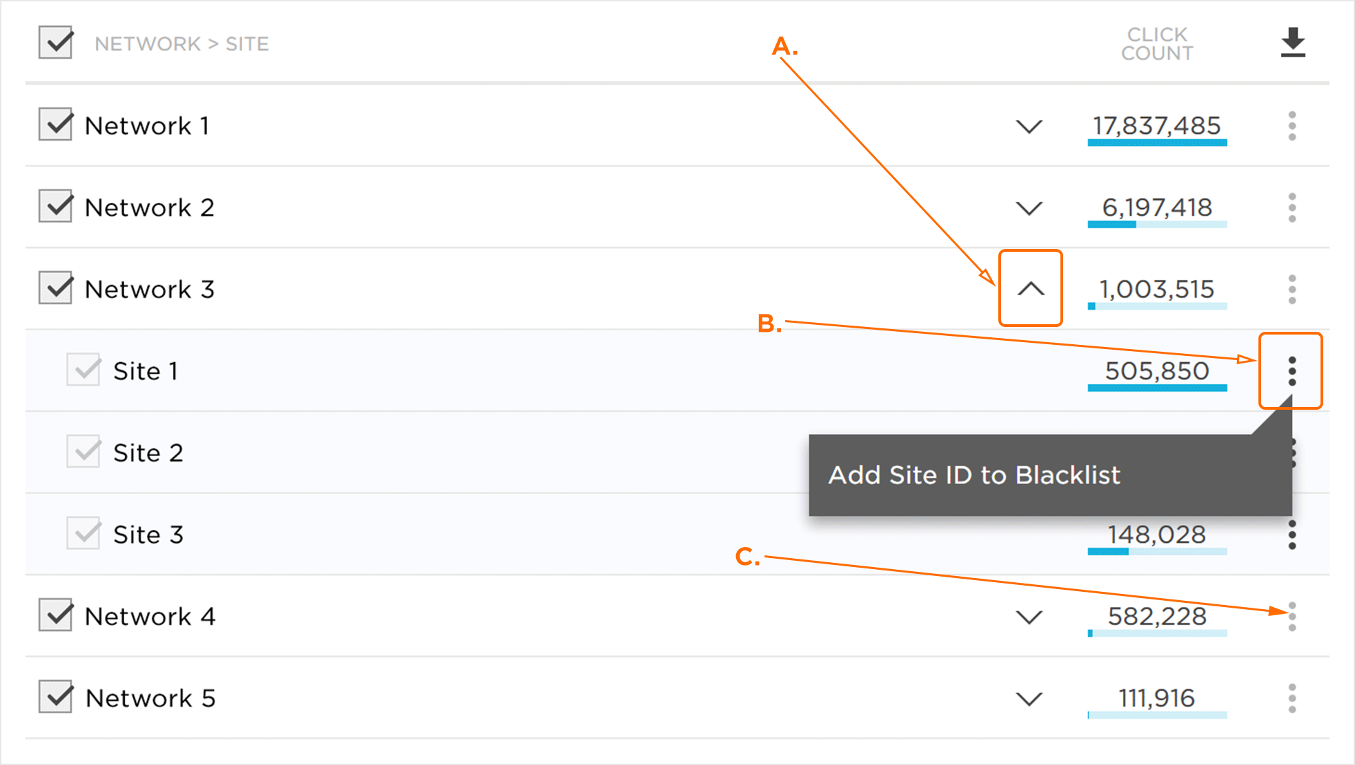 营销人员有机会将site添加到其帐户黑名单中,从而可以应用 Fraud Blacklist流量验证规则。