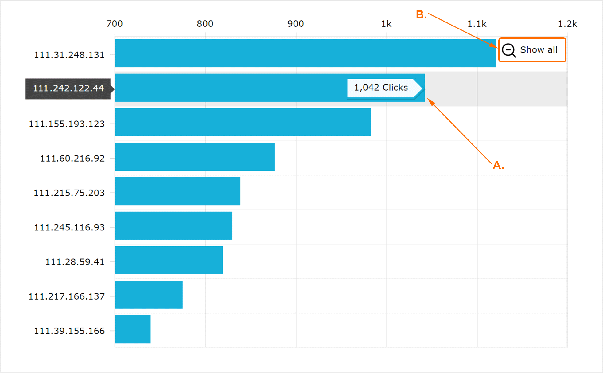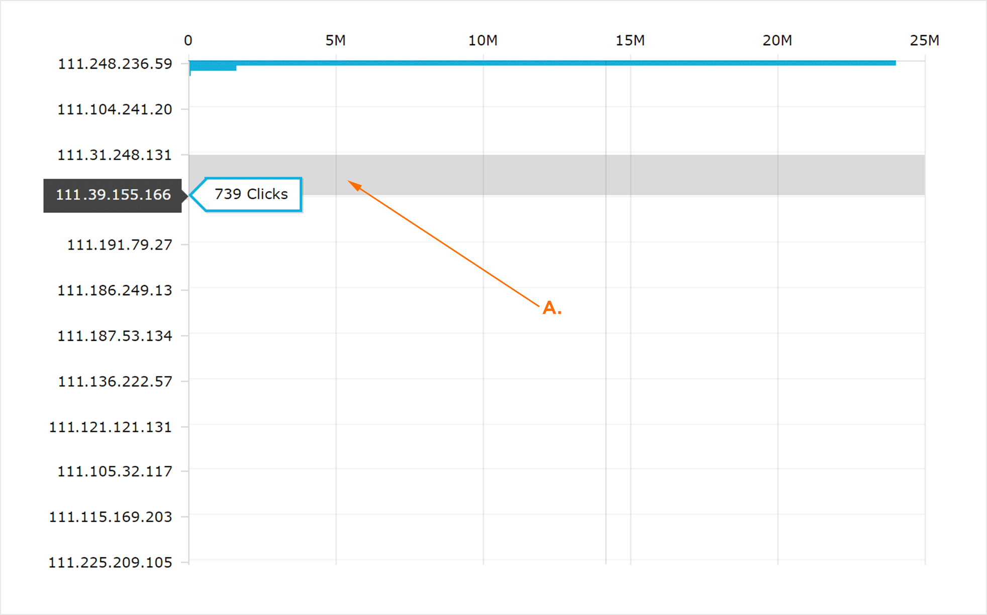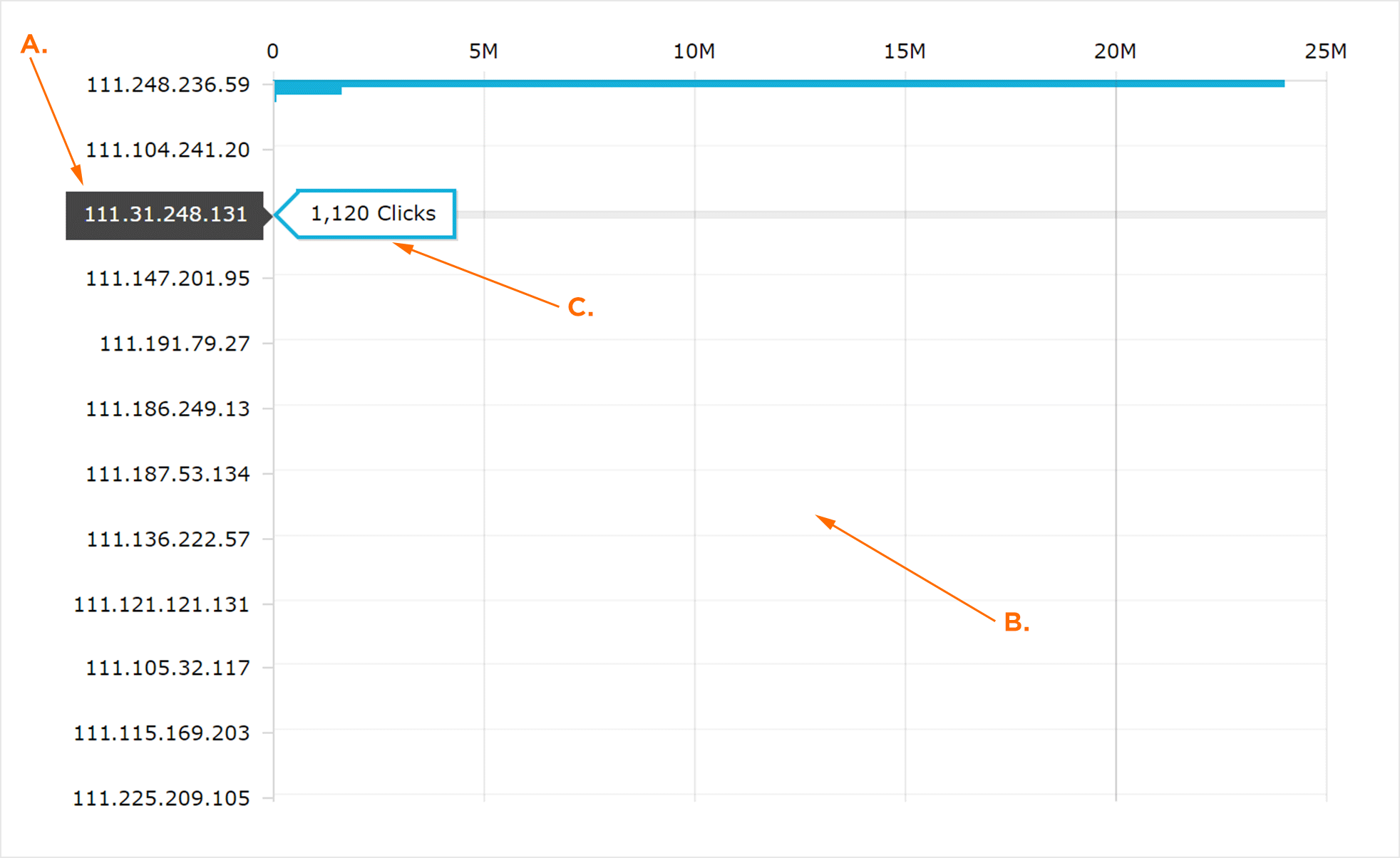 “IP地址点击量”图是一个IP地址的直观表示,其中包含大量关联的点击量。鼠标移动到任何行上将显示相应的IP地址的点击量。