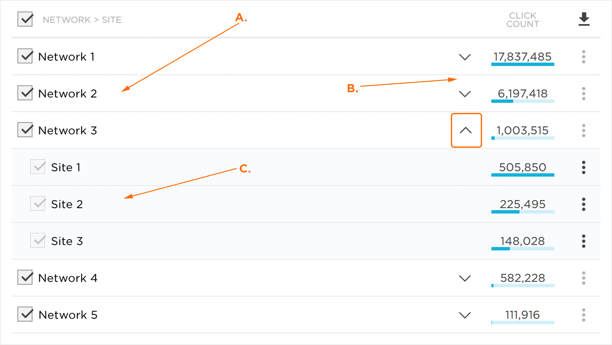 详细数据部分详细介绍了特定的点击次数。数据按选定的分组依据选项组织,选择或取消选择反映在IP地址点击量图中。数据也可以导出到CSV文件。