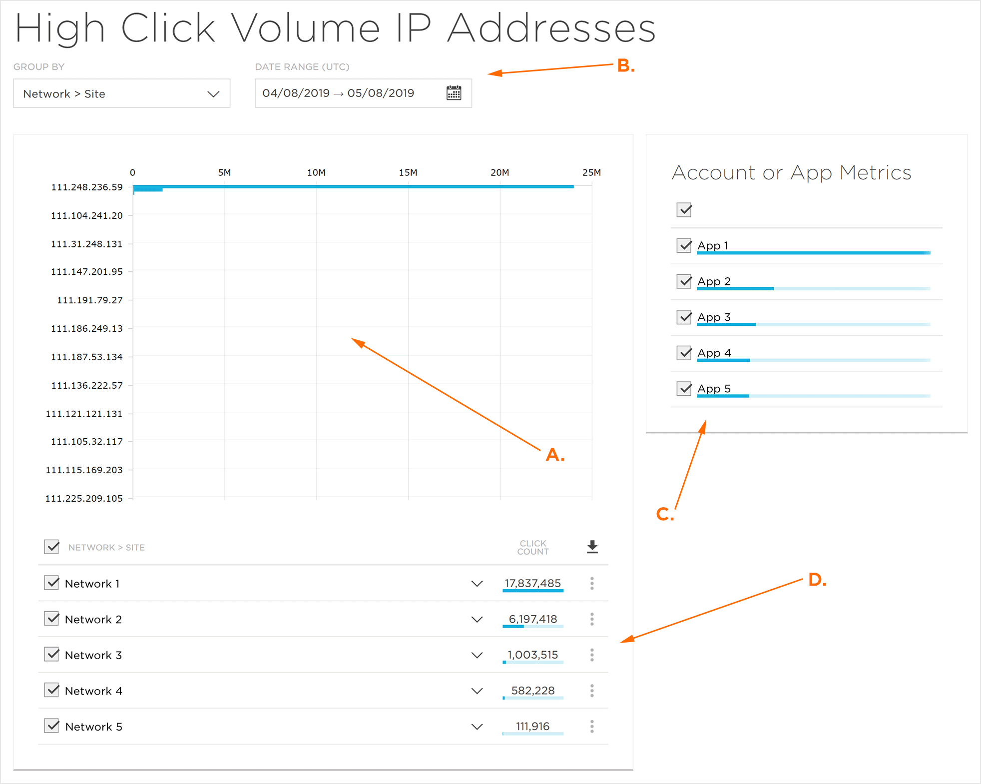 大点击IP地址页面分为四个主要部分,IP地址点击量图,指标部分,帐户/应用选择部分和数据详细信息部分。
