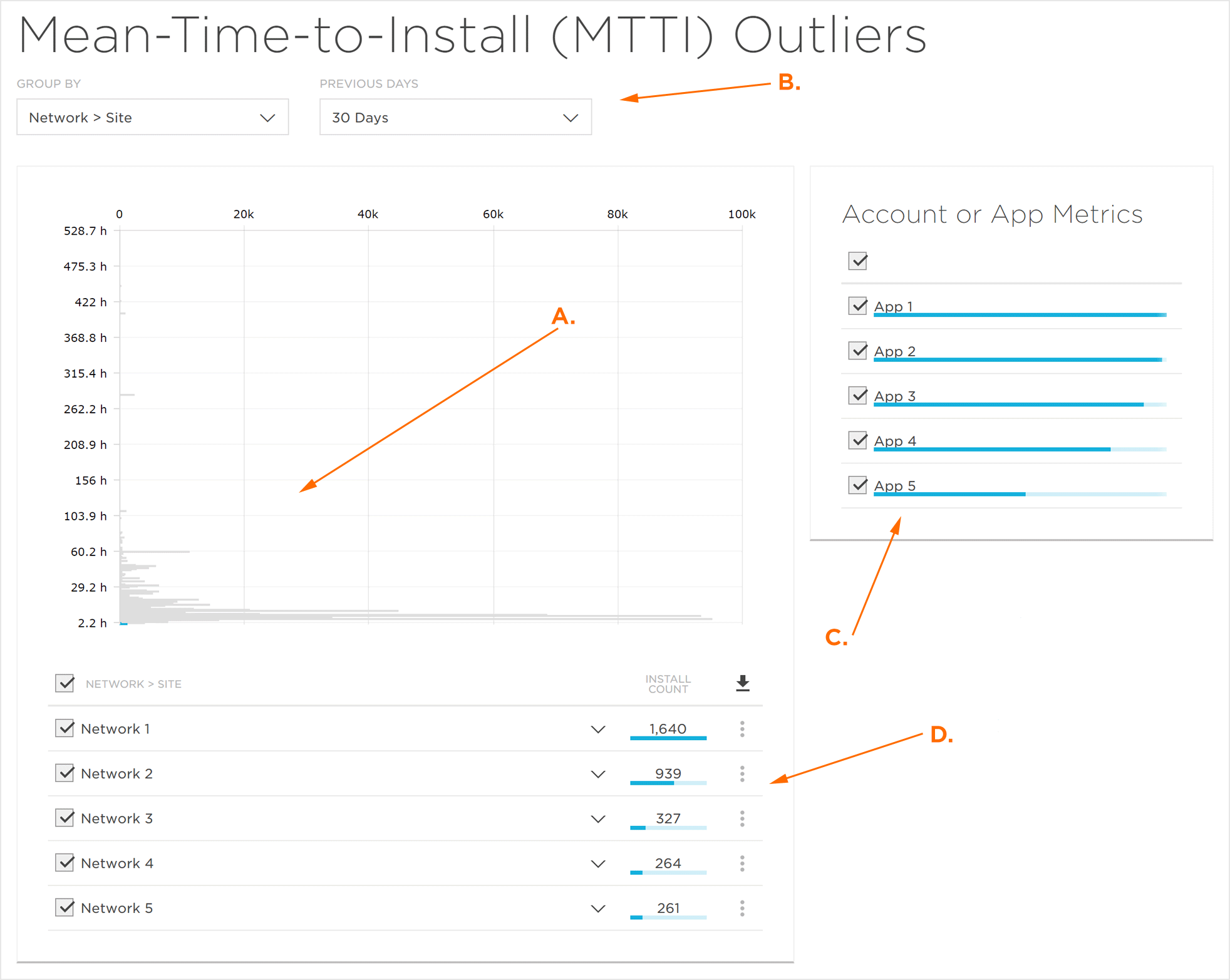 MTTI Outliers图表是安装数量的可视化表示,它不属于点击和安装之间的平均时间。将鼠标悬停在任何行上会显示相应安装的总数以及被标识为异常值的安装数量。