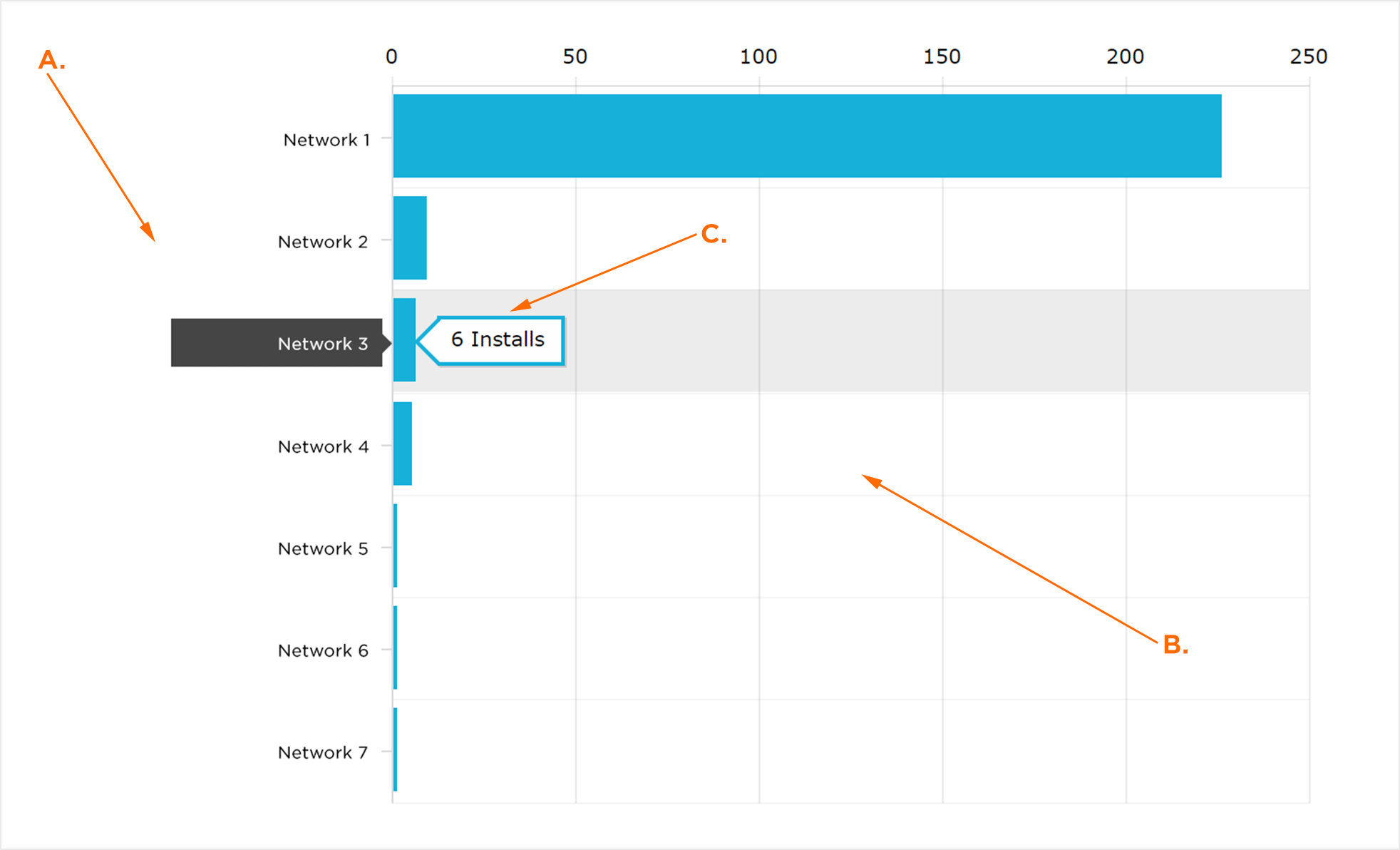 未验证的安装收据卷图是广告平台中没有来自应用商店的已验证安装收据的安装次数的可视化表示。鼠标悬停在任何行将显示相应的网络安装而不收到。