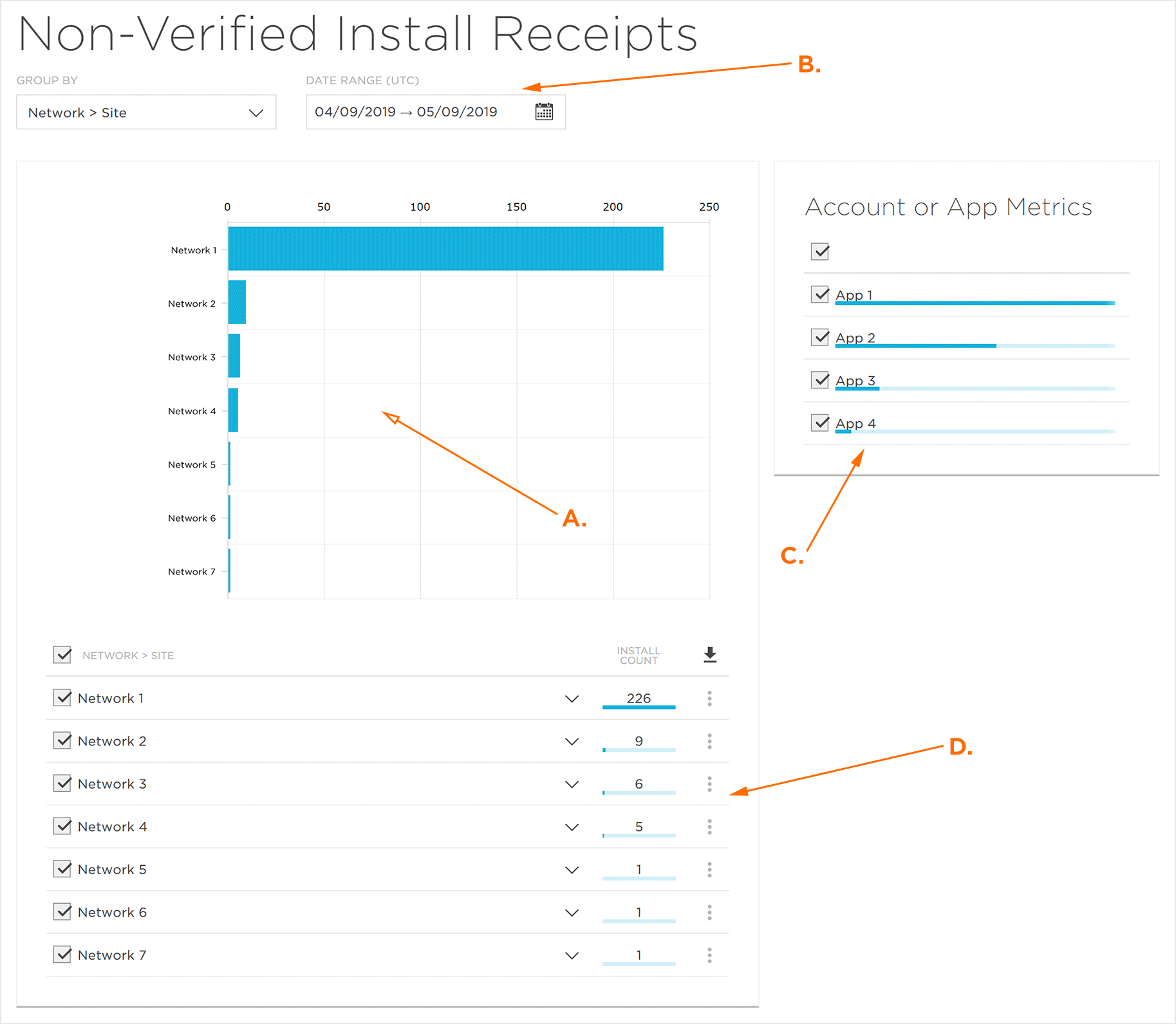 详细数据部分详细介绍了特定的安装计数。数据按选定的分组依据选项进行组织,选择或取消选择将反映在未验证的安装收据量图中。数据也可以导出到CSV文件。