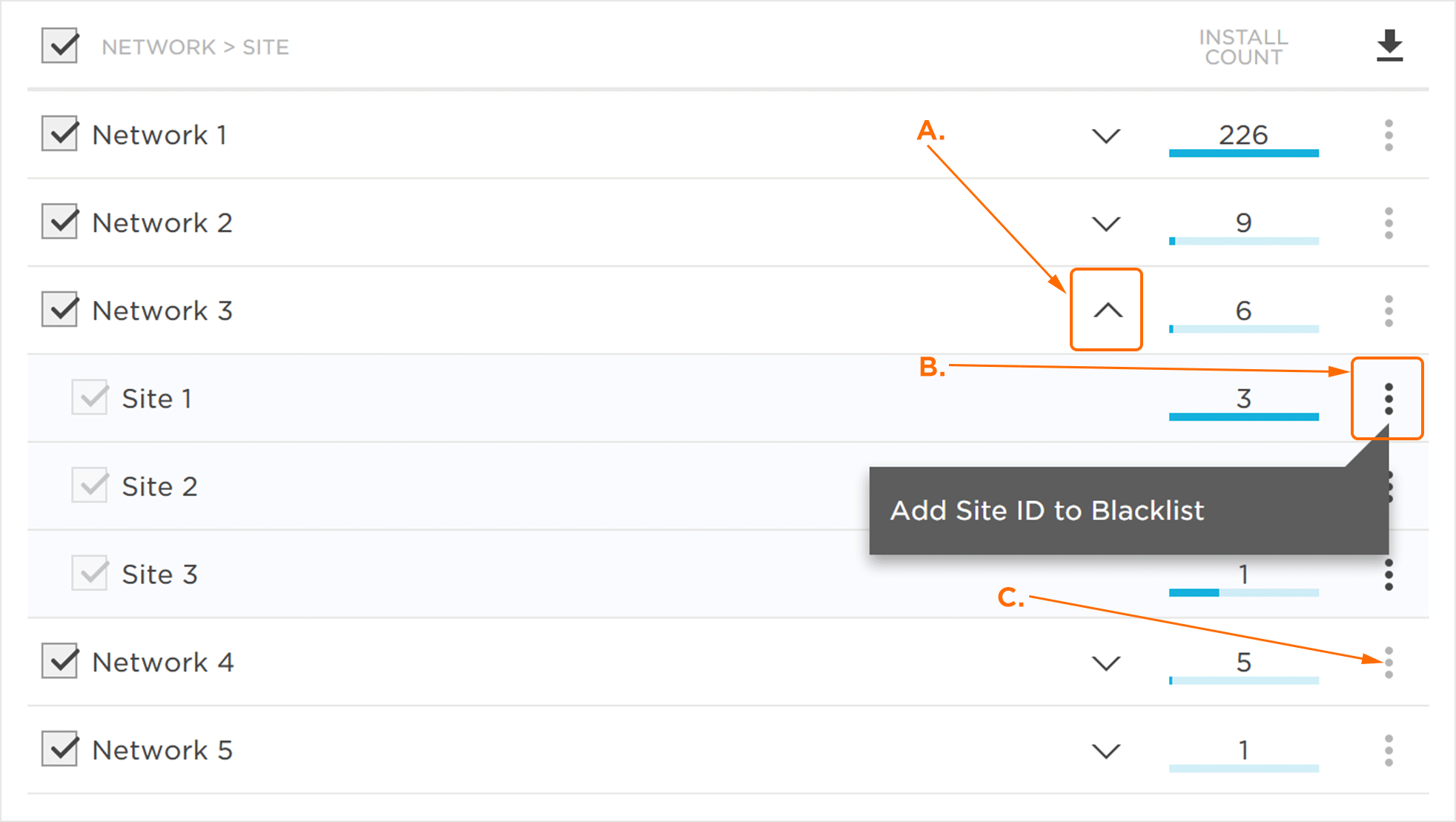 注意:应用,广告平台和跟踪器不符合加入全球欺诈黑名单的资格。他们将“将Site id添加到黑名单”按钮将显示为灰色。