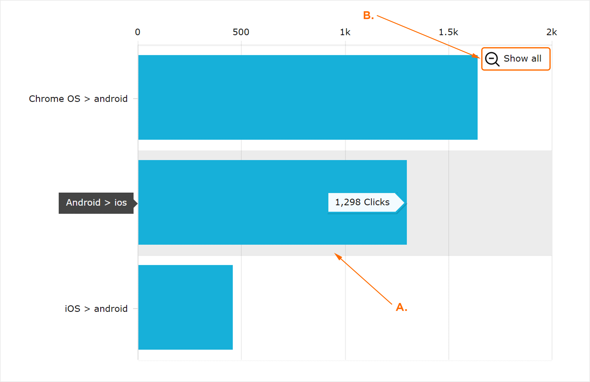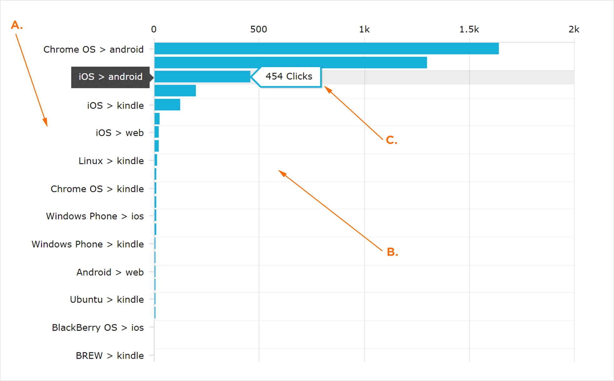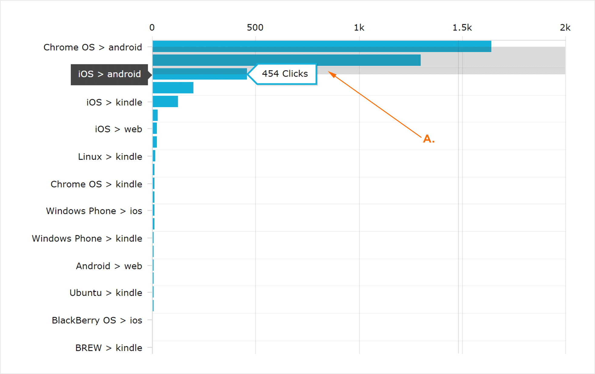 “单击/安装平台不匹配”图形是安装后点击的设备平台与设备平台不匹配时发生的直观表示。将鼠标悬停在任何行上会显示相应的平台不匹配点击量。