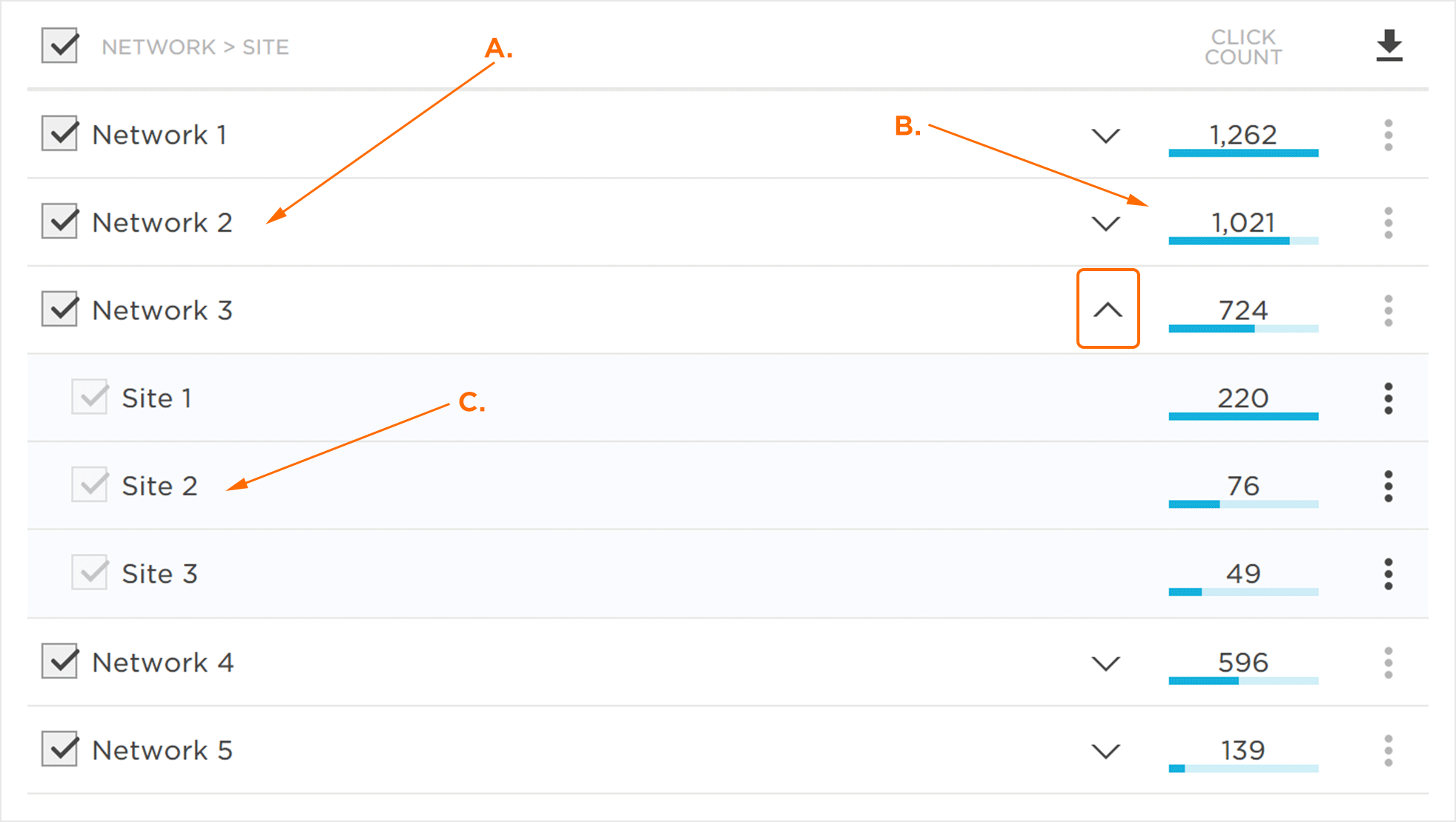 通过单击下载按钮导出详细数据部分中的数据。