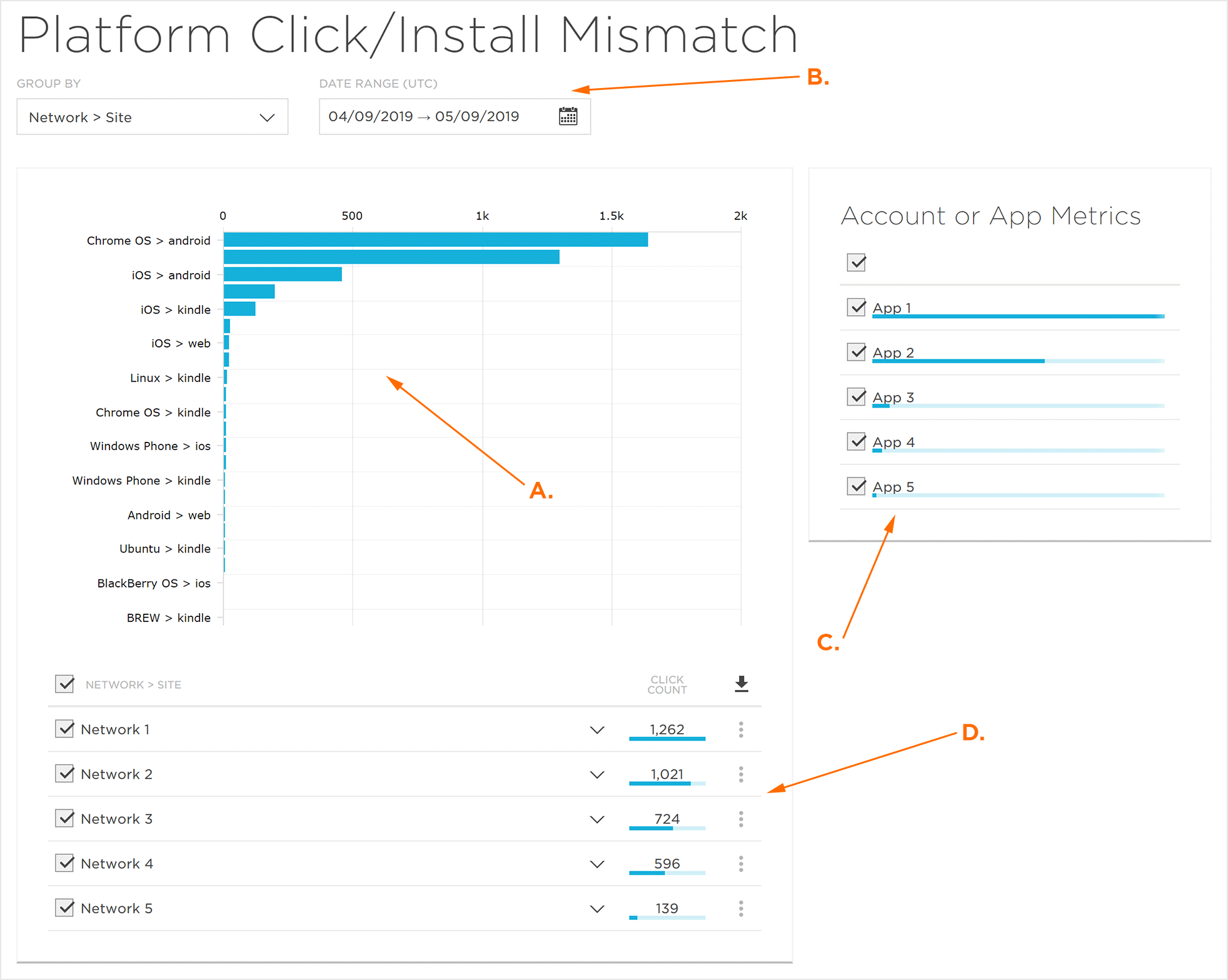 点击/安装平台不匹配页面提供了点击的平台与安装的平台之间的不匹配的详细视图。