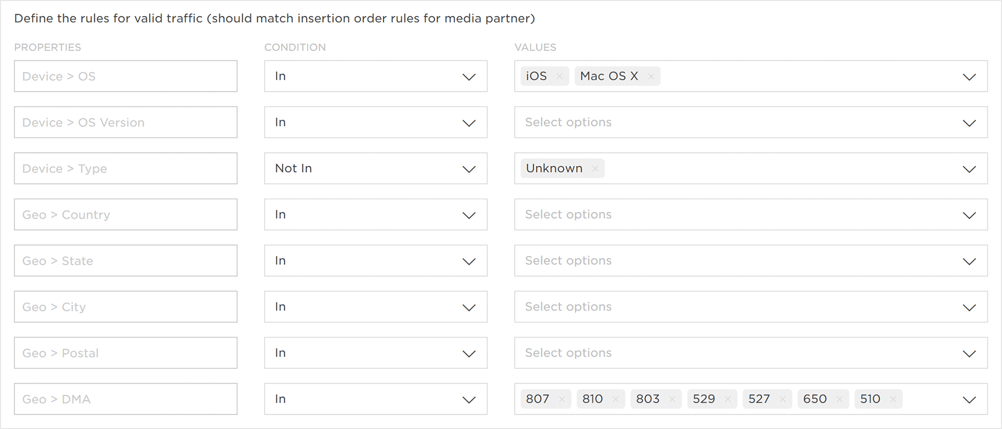 最佳实践:建议使用与广告联盟和发布商的定位条件类似的方法。 (即,使用“匹配”条件来识别您的目标受众)