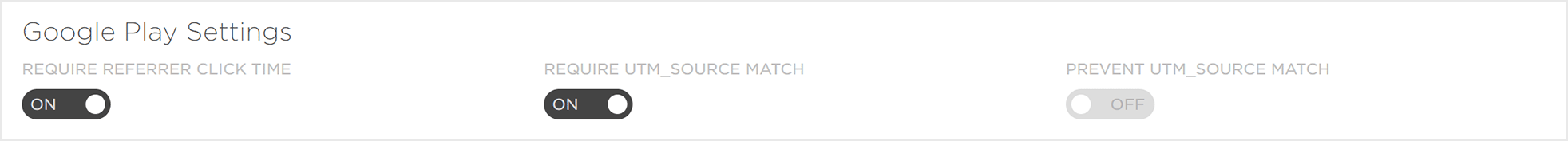 需要UTM_Source匹配:启用此选项将需要UTM_Source,该UTM_Source标识site将用户发送到应用商店。 UTM_Source传递到Google Play商店,然后从游戏商店传递到TrackingIO Global。 UTM_Source用于安装验证。如果UTM_Source不存在,则安装将确定无效。