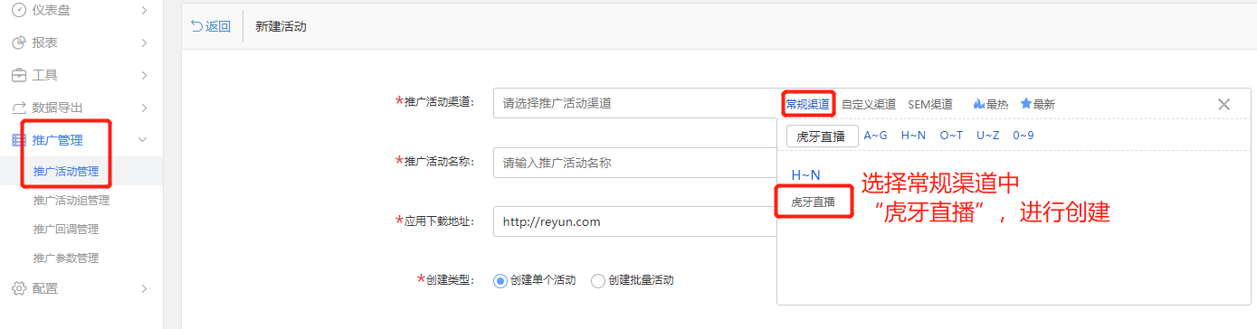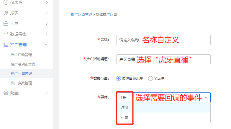 开启注册或付费回调:推广活动管理>自定义回调管理>推广活动渠道选择“虎牙直播”,在事件中选择“注册”或“付费”。