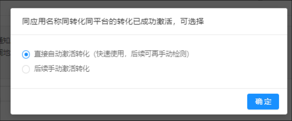 如账户已存在同应用名称同转化目标同平台的已激活转化追踪,新建完转化追踪保存后,会弹窗可选择自动激活,跳过手动联调阶段