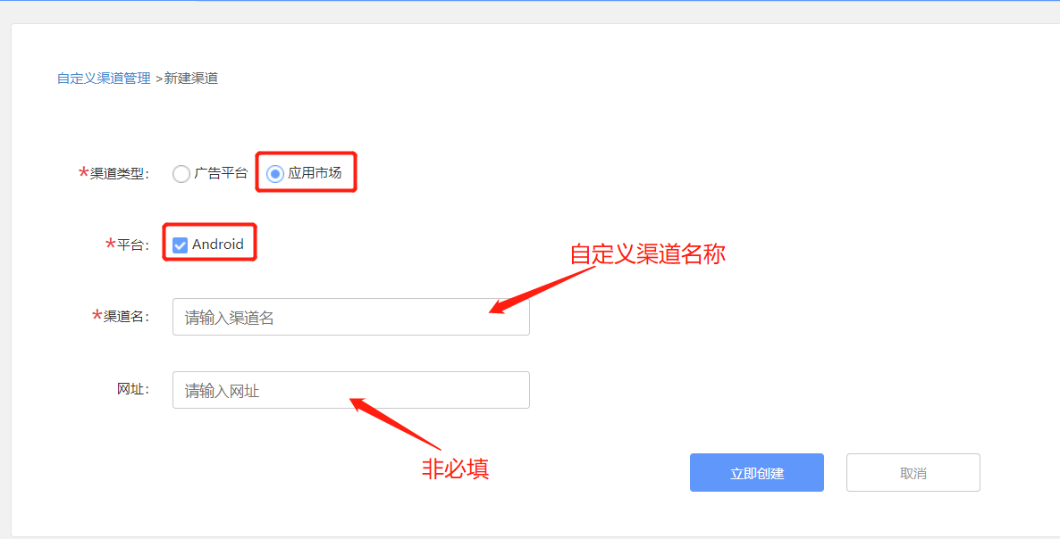 (2)若无对应渠道,可创建自定义渠道,方法如下:右上角扳手图标-渠道管理-自定义渠道-新建渠道-渠道类型选择应用市场-平台Android-渠道名称自定义,网址为非必填项。如下图所示: